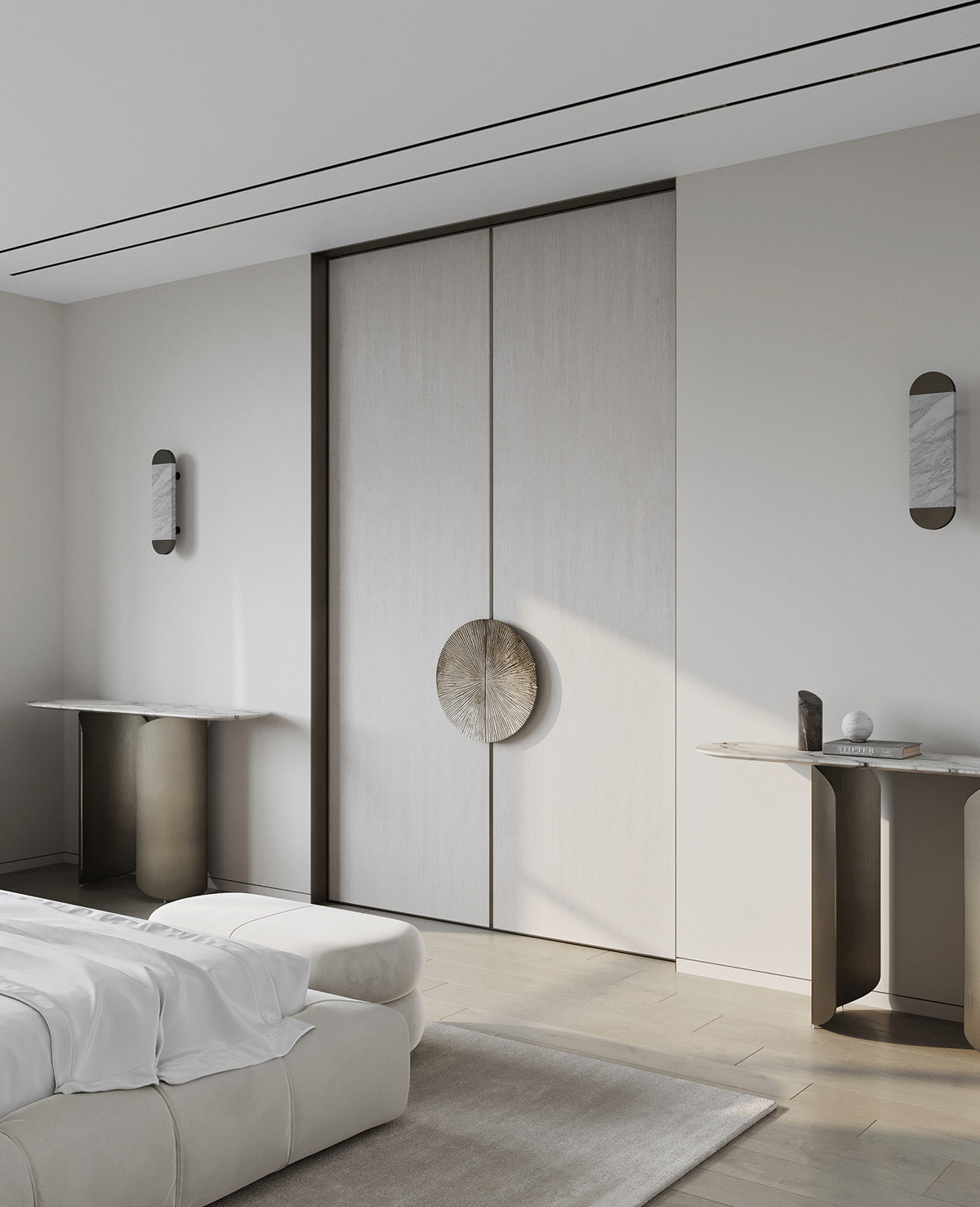 香檳酒的味道再次出現(xiàn)在雙人臥室控制臺(tái)桌子的曲線腿上。