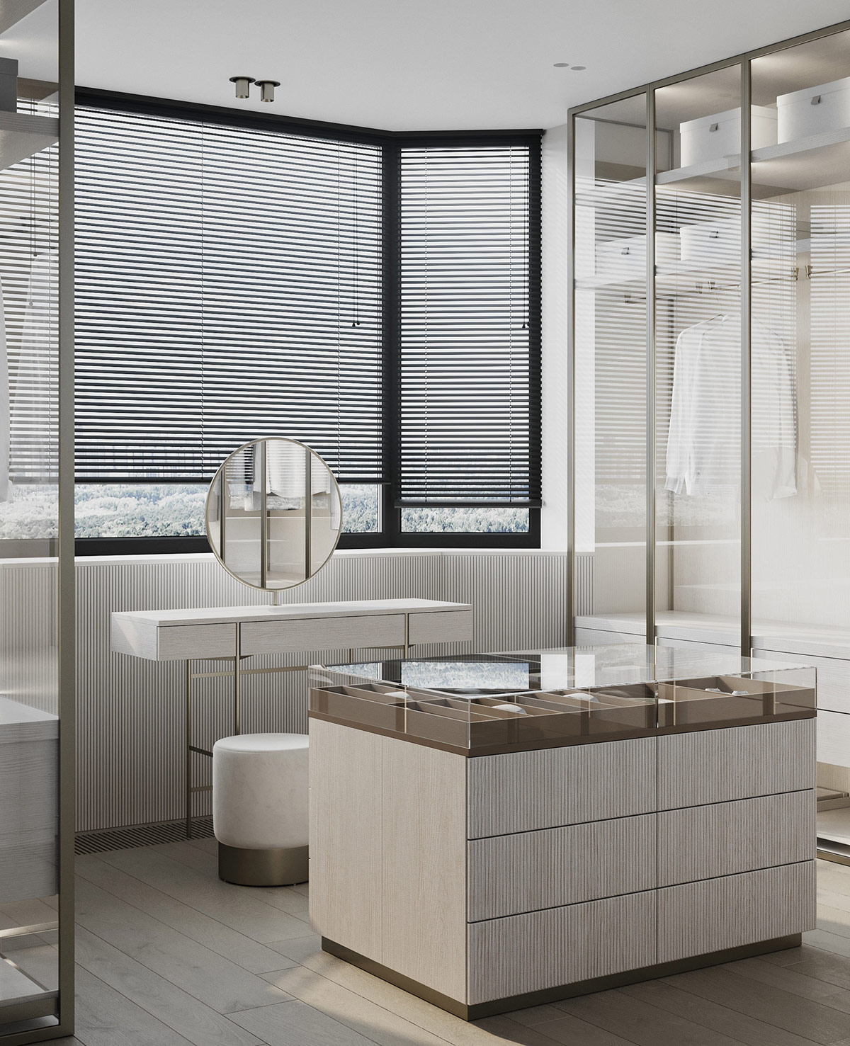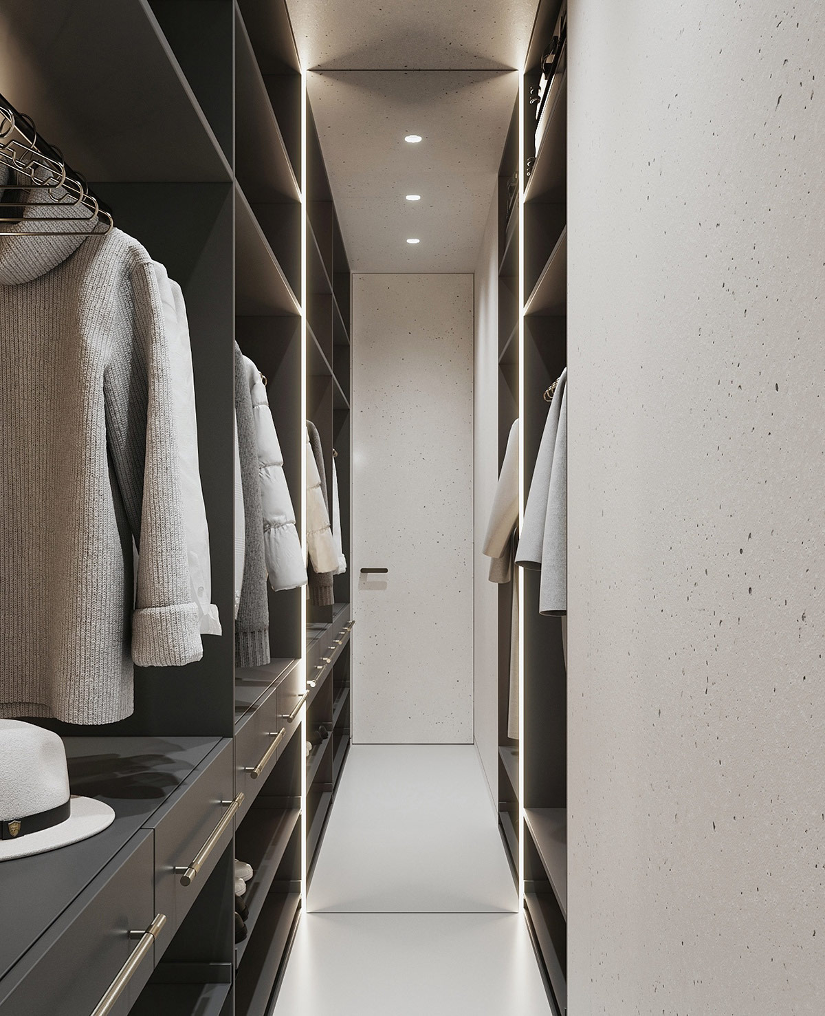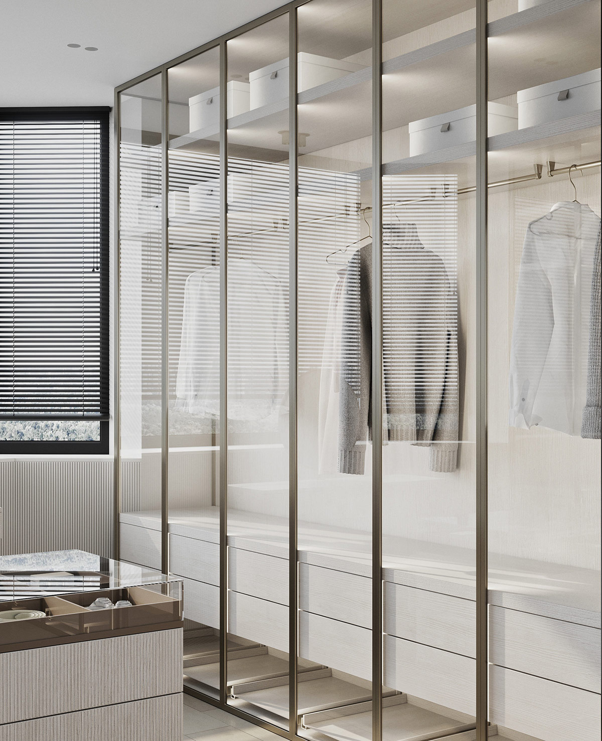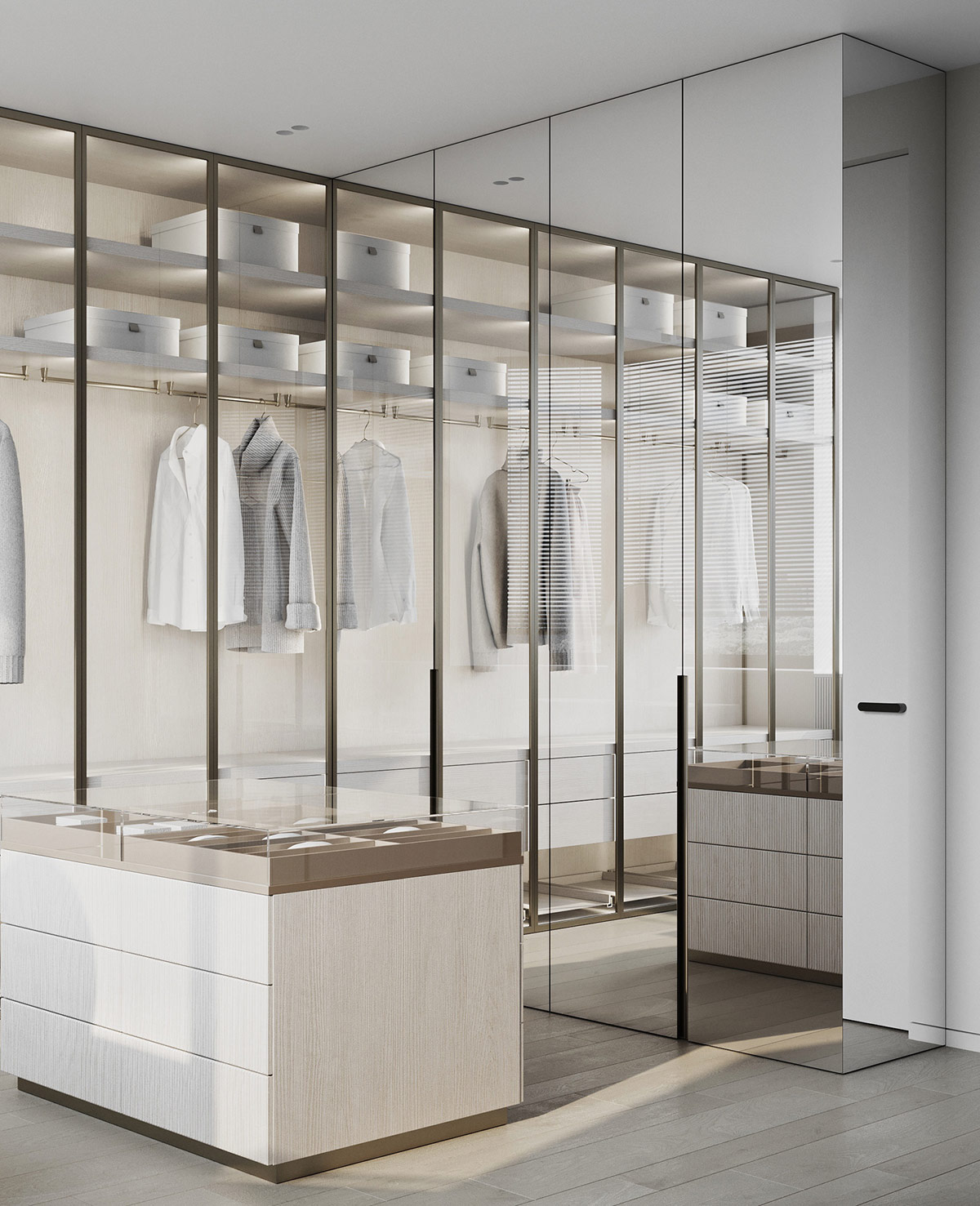 在步入式衣櫥內(nèi),一面無(wú)框鏡子營(yíng)造出一排更長(zhǎng)的衣架和抽屜的錯(cuò)覺(jué)。