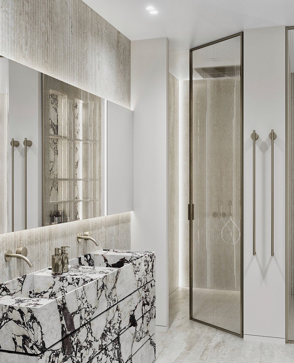 大理石浴室后擋板和鋼框淋浴屏上的垂直凹槽波紋。