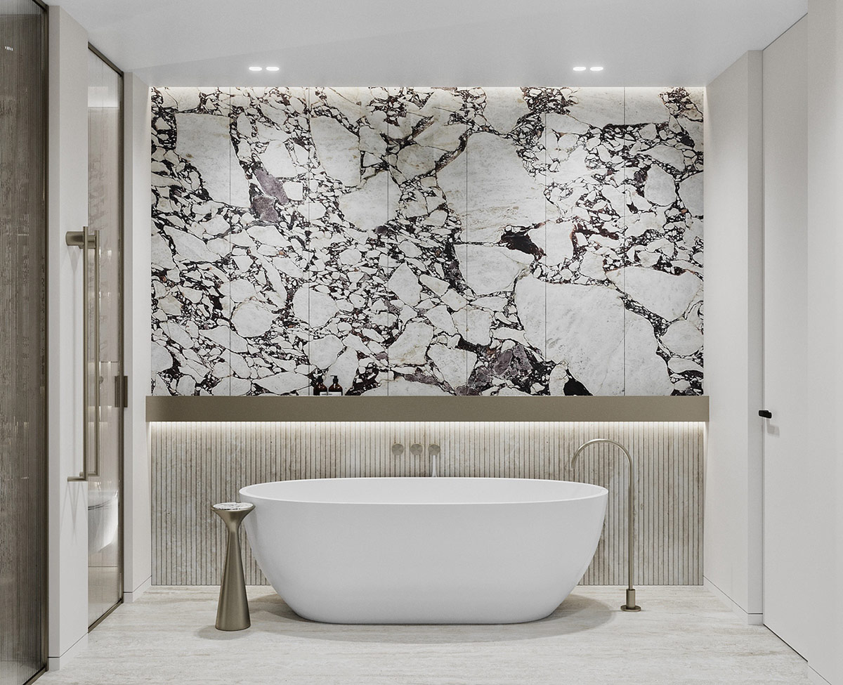 另一個(gè)華麗的大理石組合在現(xiàn)代獨(dú)立式浴缸后面創(chuàng)造了兩個(gè)色調(diào)的背景。