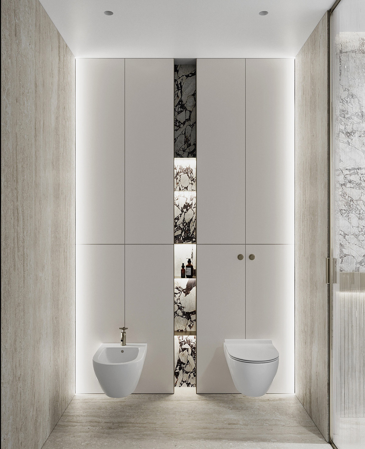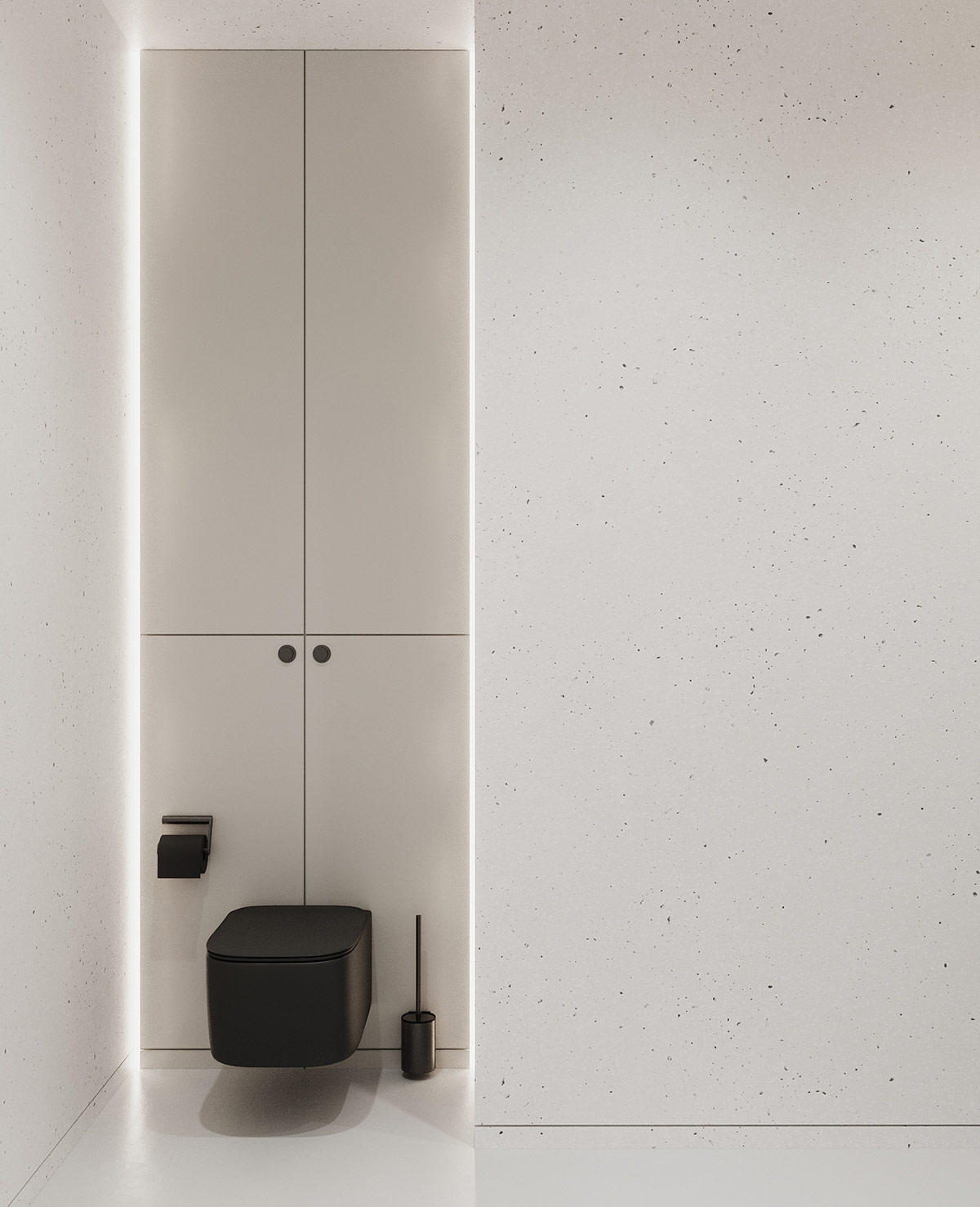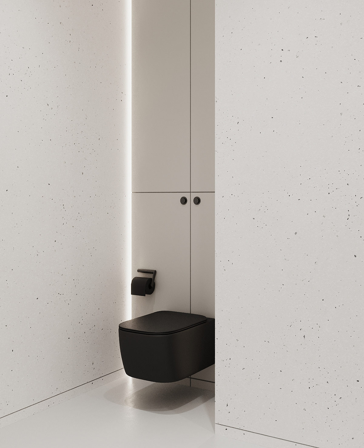 嵌入式 LED 燈條照亮了狹窄的廁所角落。