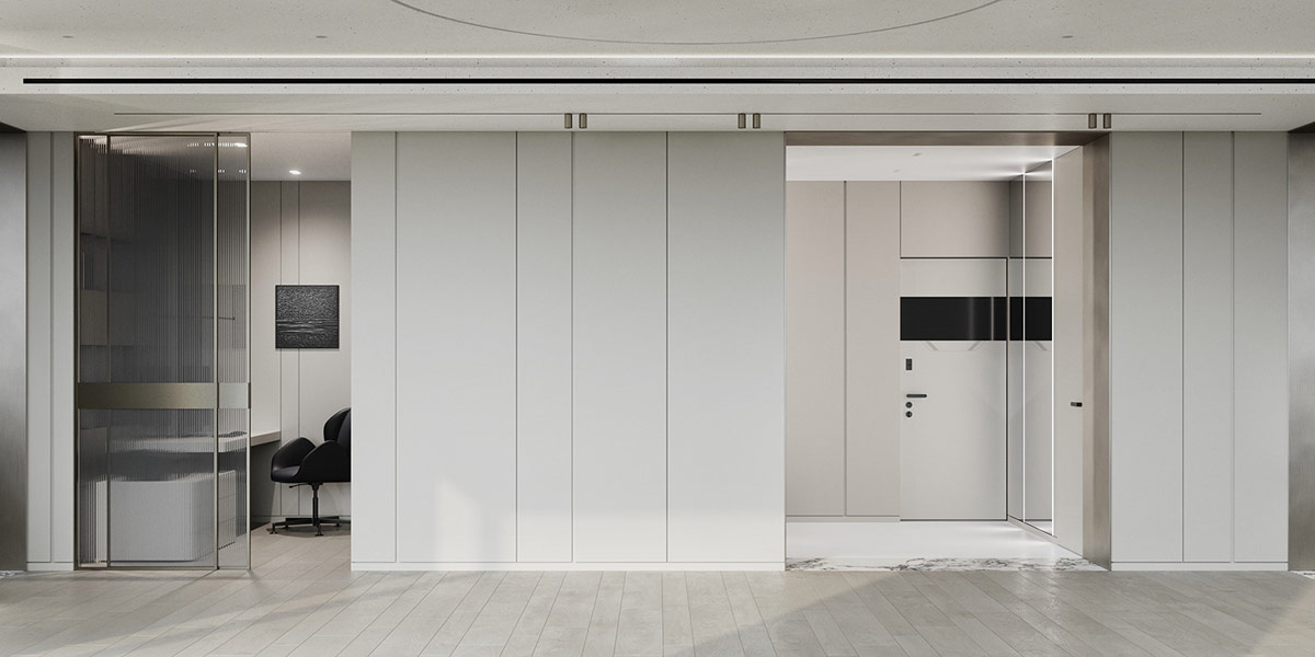大理石門檻和深金屬門窗取代了整個(gè)公共區(qū)域的傳統(tǒng)實(shí)心門。