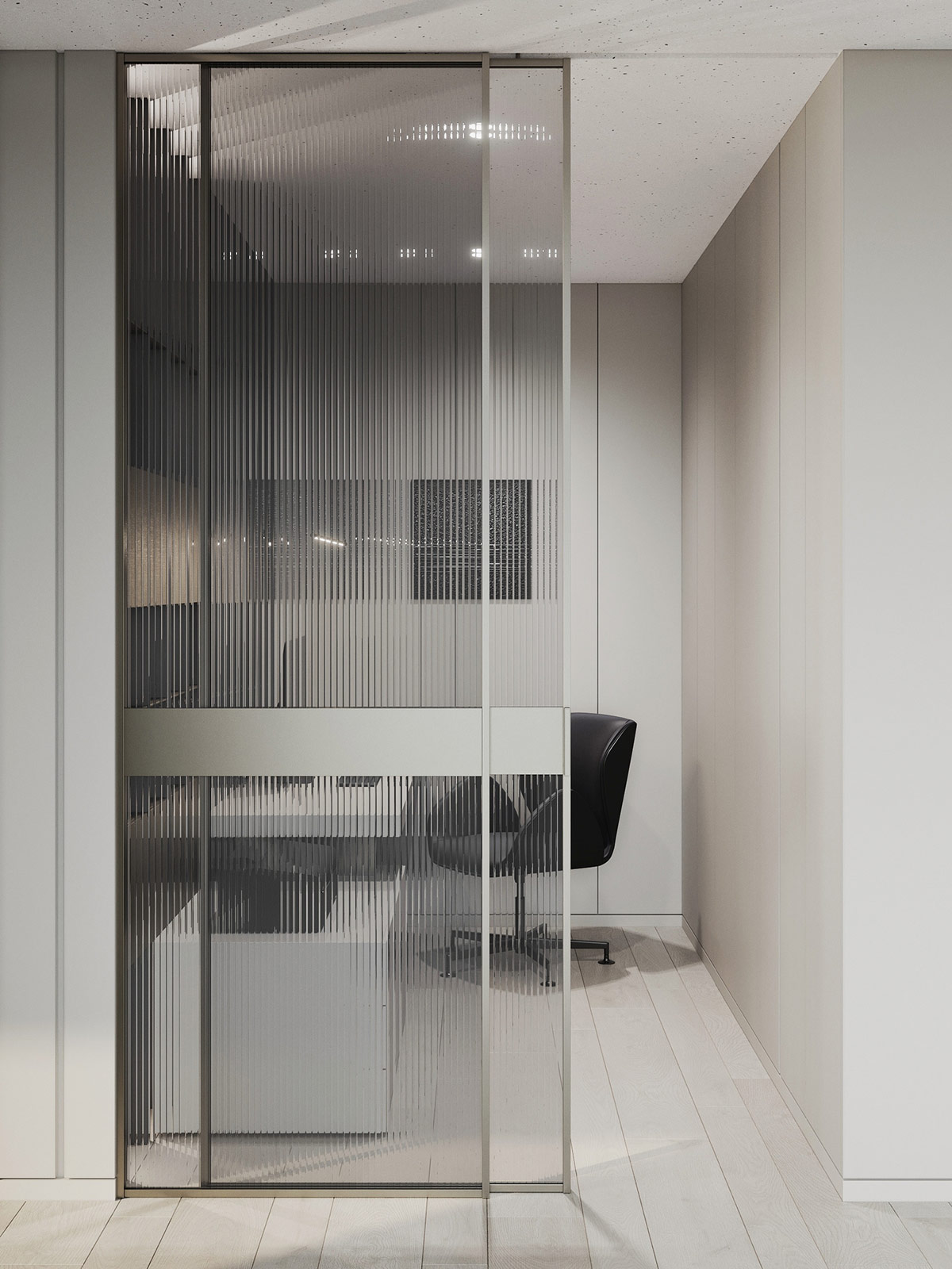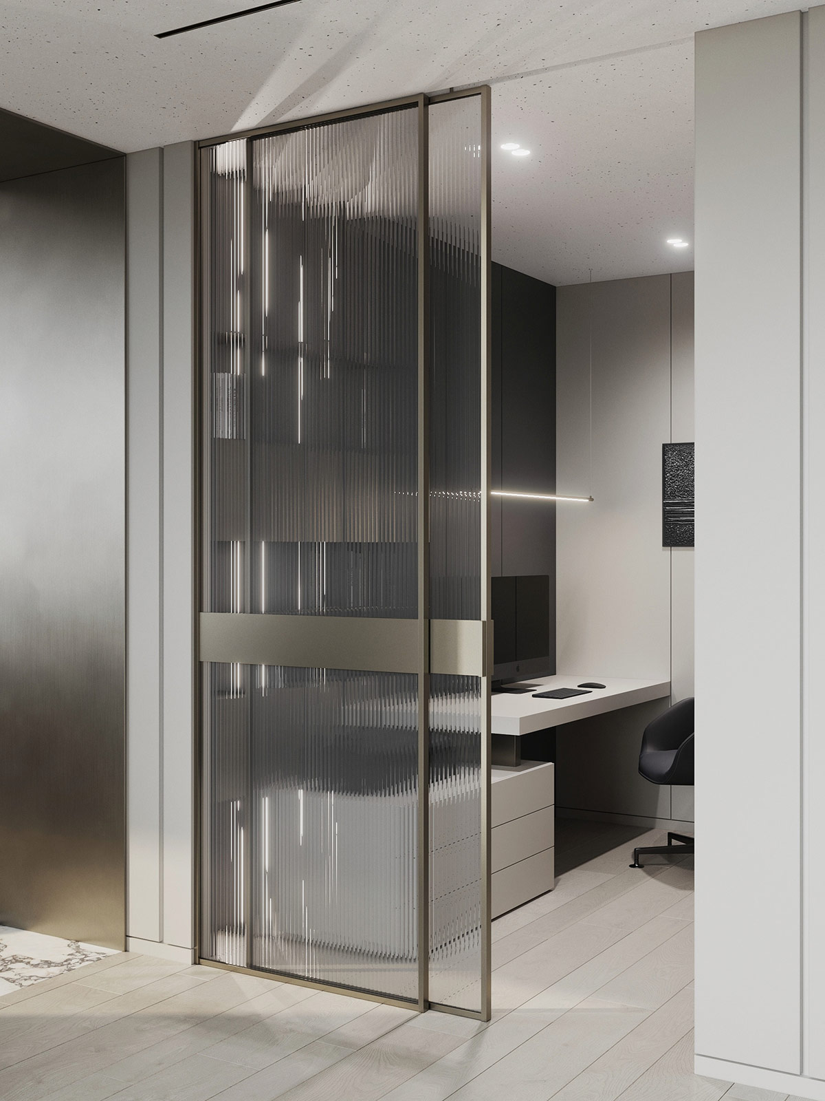 棱紋玻璃巧妙地將家庭工作區(qū)與休息室隔開(kāi),以保持放松和義務(wù)之間的界限。