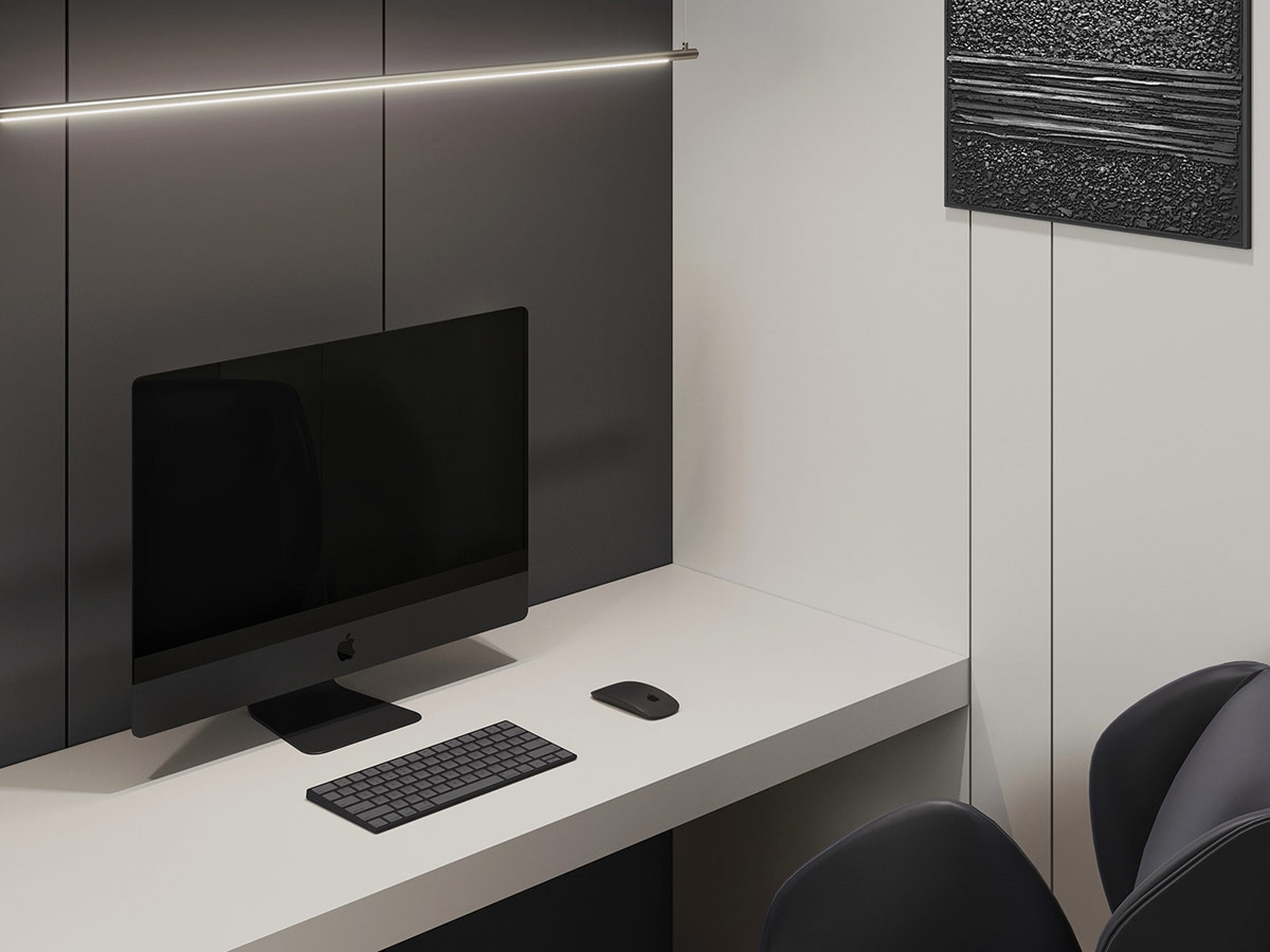 一張現(xiàn)代風(fēng)格的桌子輕輕地漂浮在一個(gè)基本的抽屜單元上方,然后與白色的墻板干凈地融合在一起。