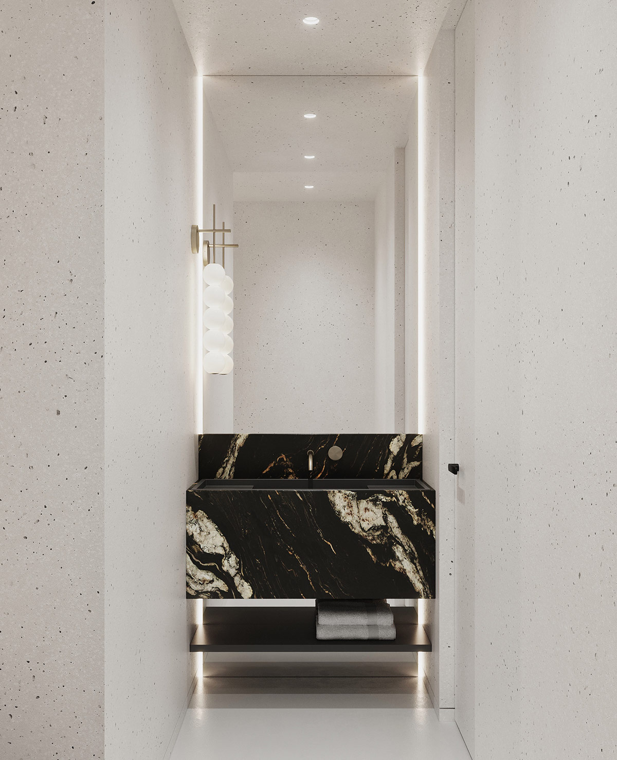 在客用浴室內(nèi),一個(gè)聳人聽(tīng)聞的黑色大理石梳妝臺(tái)與簡(jiǎn)化的白色裝飾方案相映成趣。低調(diào)的背景讓這件非凡的作品理所當(dāng)然地占據(jù)主導(dǎo)地位。