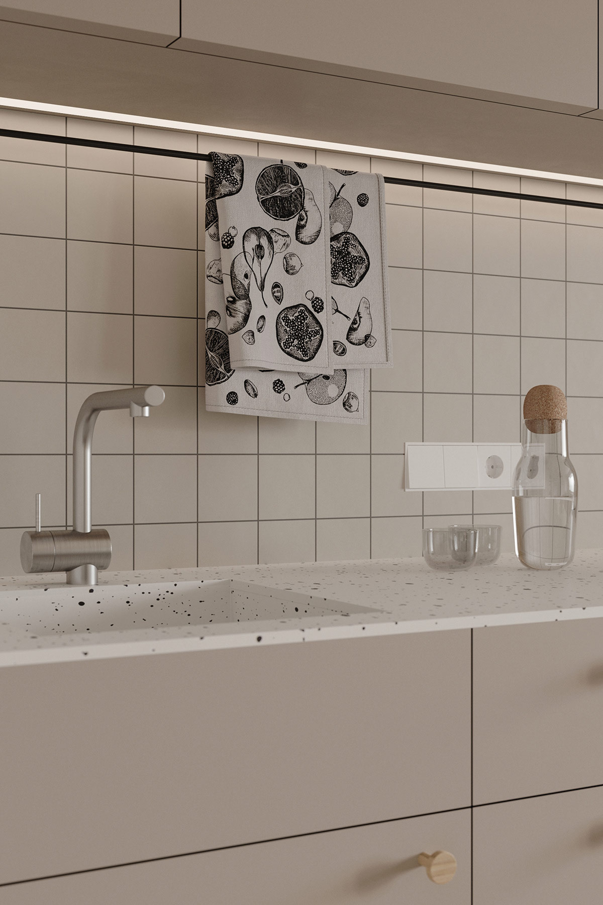 玻璃杯、玻璃水瓶和現(xiàn)代鍍鉻廚房水龍頭在櫥柜下的 LED 條形燈下閃閃發(fā)光。