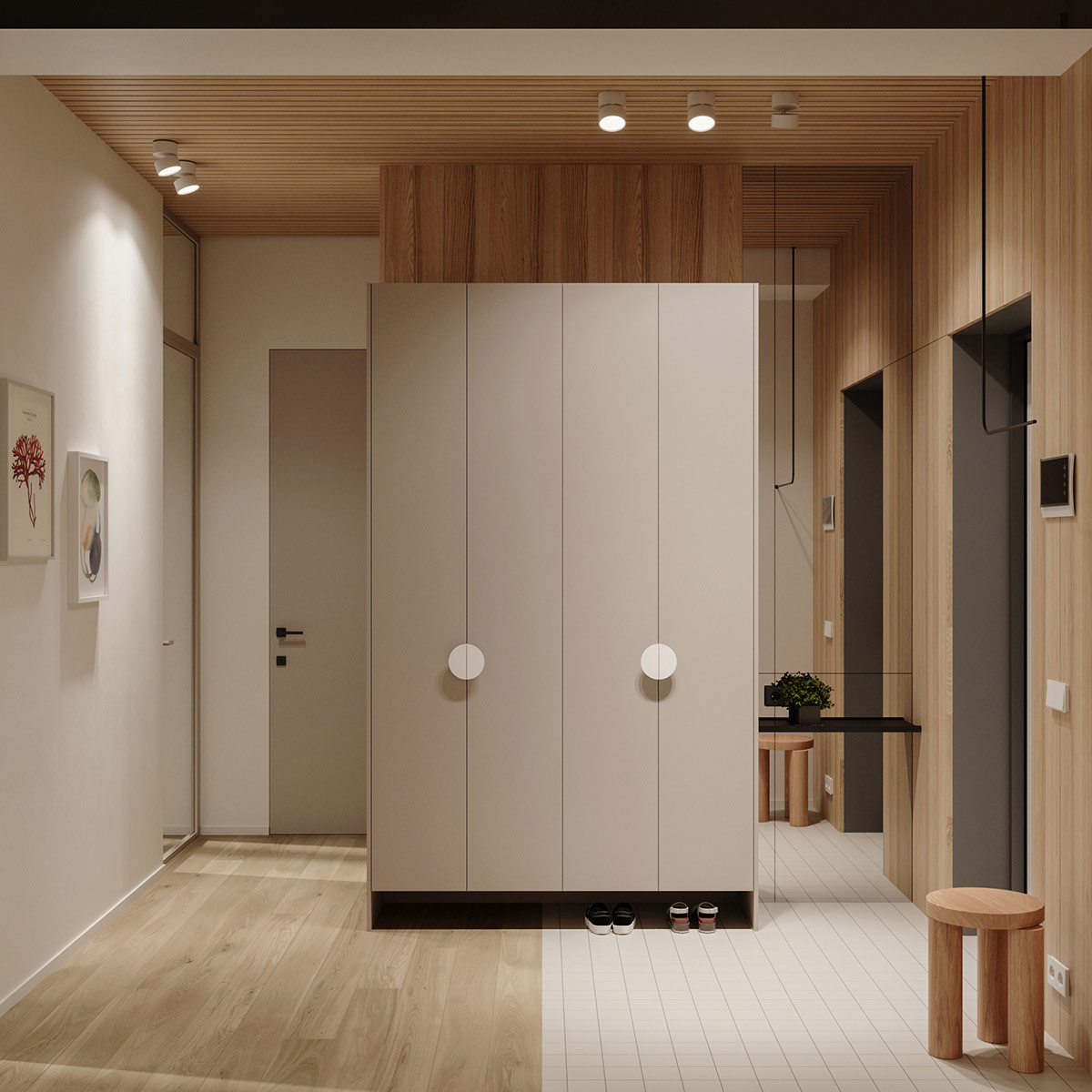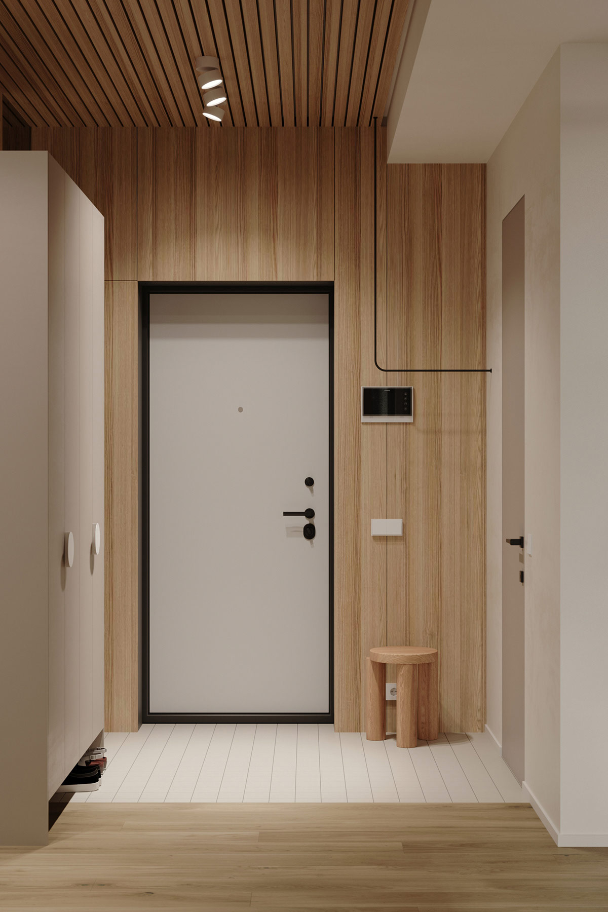 光滑的木板條天花板處理再次出現(xiàn)在家庭入口處。木包層溫暖地包裹著墻壁。一個(gè)小的入口座位將木質(zhì)裝飾滑到清爽的白色瓷磚地板上。