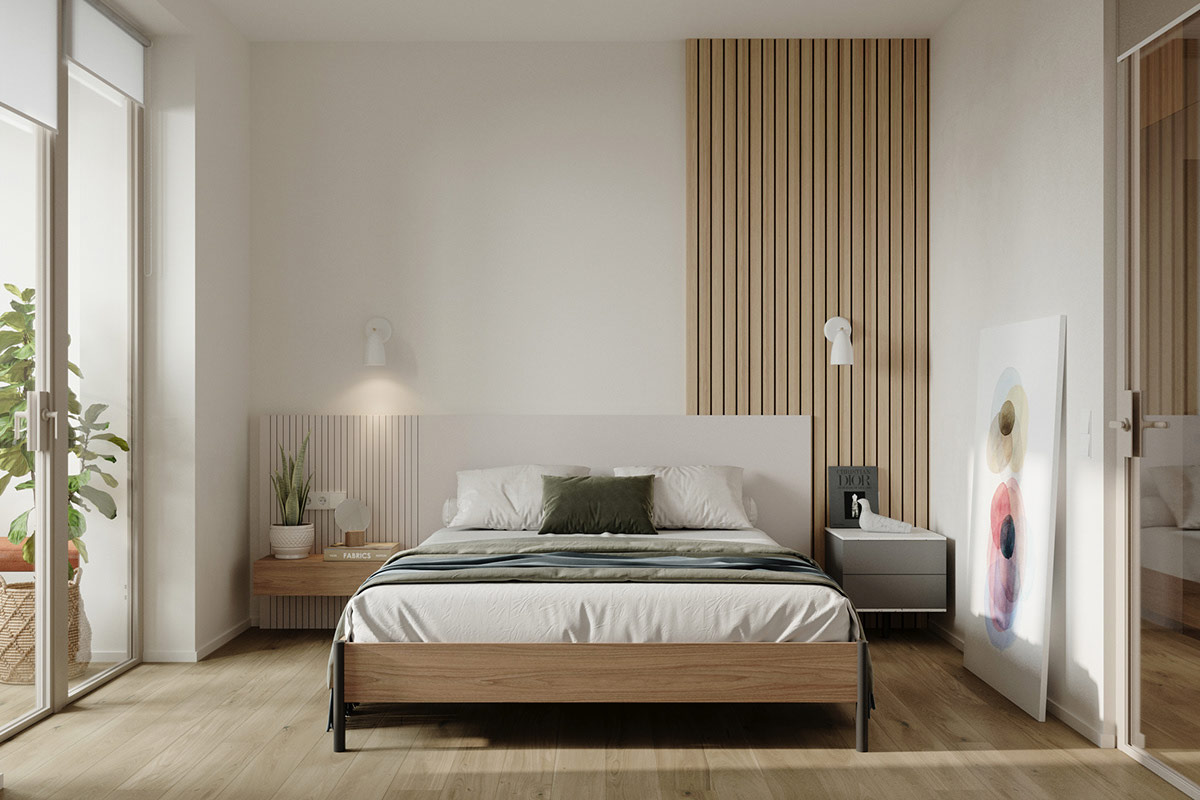 在床的這一側(cè),床頭板的設(shè)計(jì)與板條木美學(xué)相得益彰。