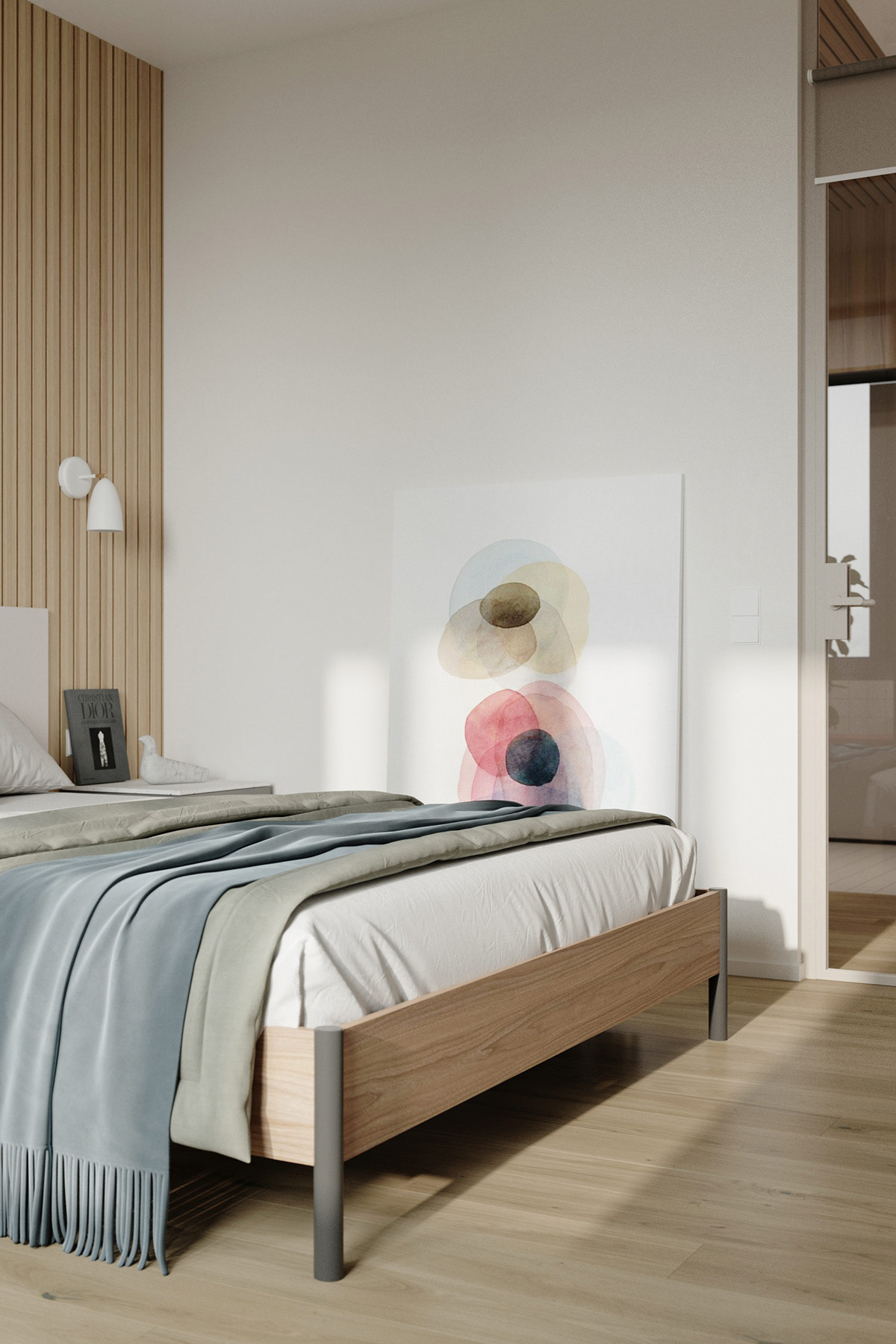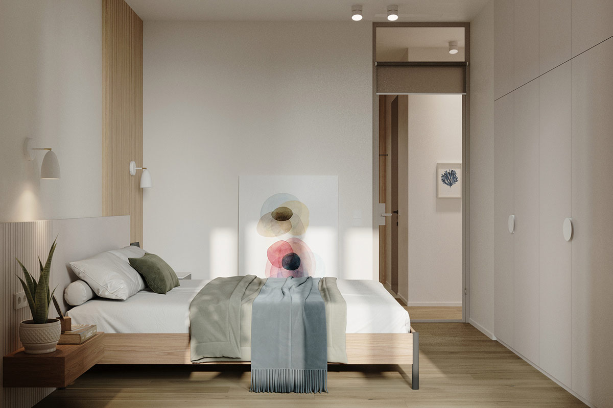 柔和的綠色被子和柔和的藍(lán)色床單在平臺(tái)床上營(yíng)造出幾層平靜的色彩。