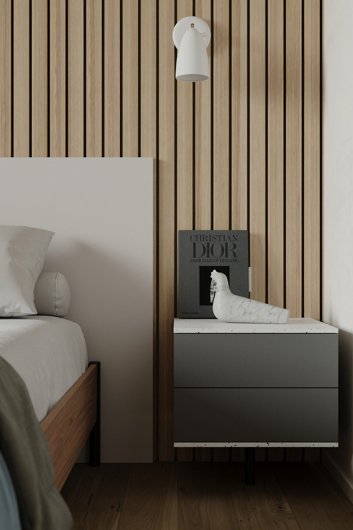 一個(gè)灰色的床頭柜上裝飾著一個(gè)由 Ronan 和 Erwan Bouroulle 于 2011 年為 Vitra 設(shè)計(jì)的L'Oiseau 鳥(niǎo)雕像。