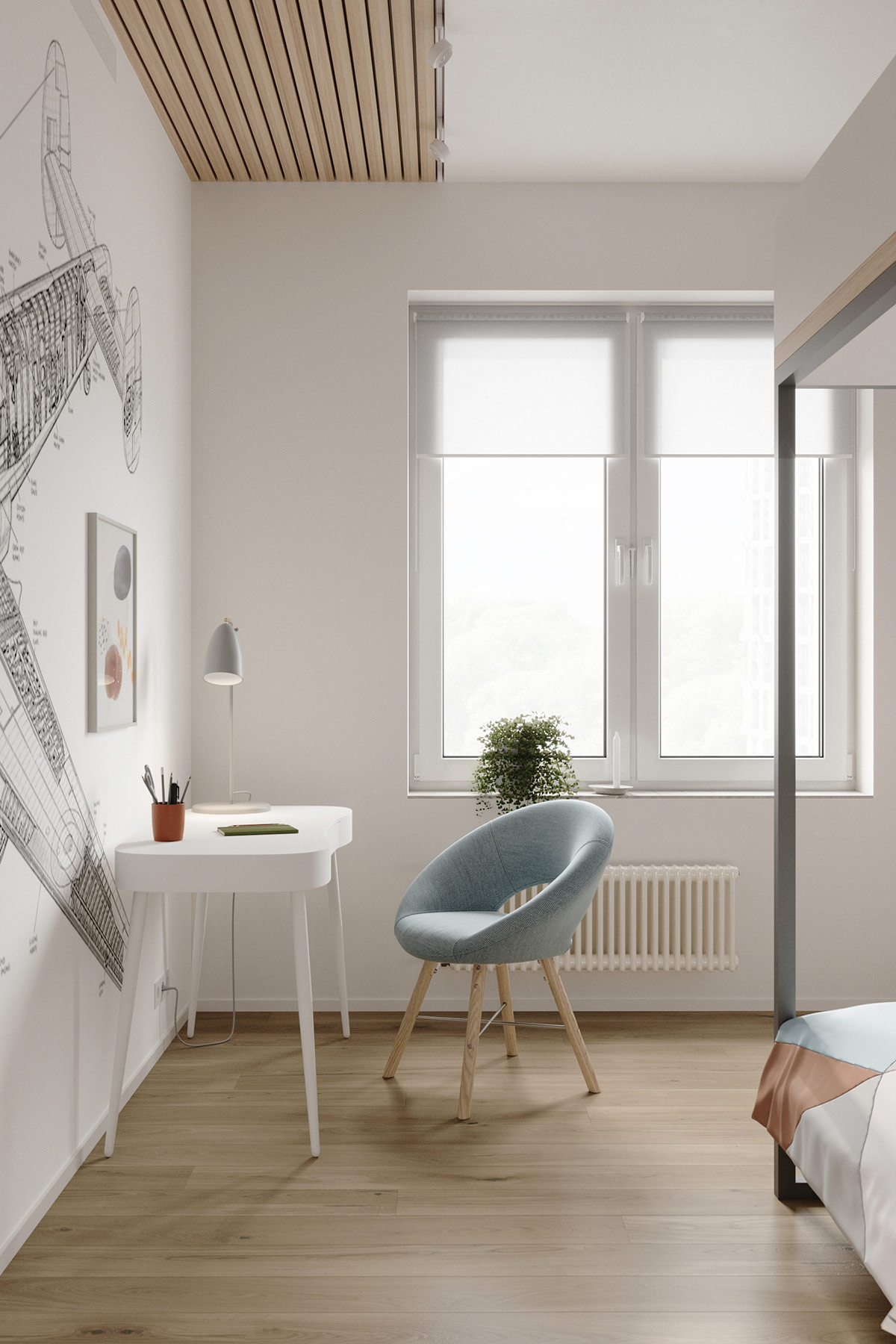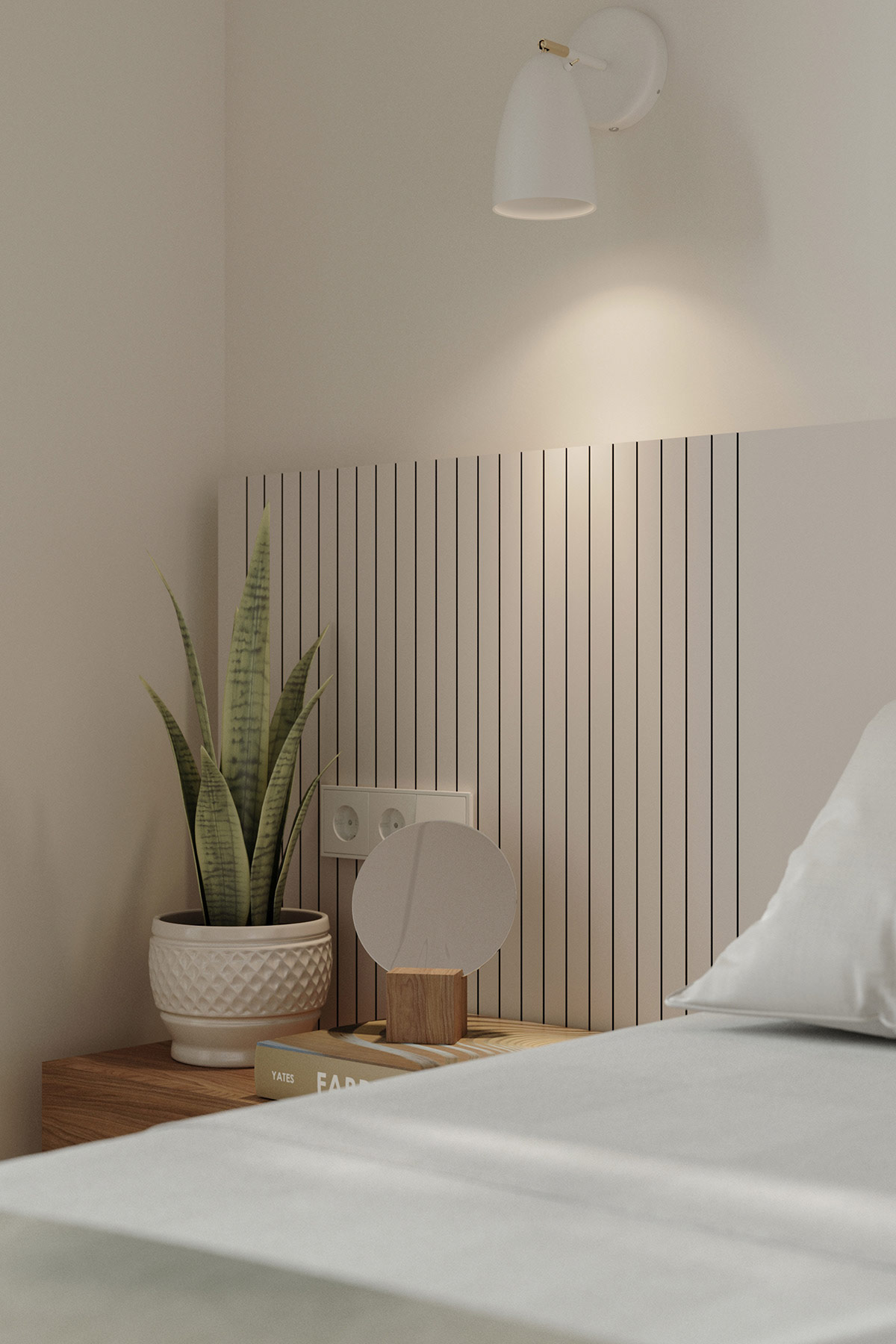 對(duì)面的床頭柜呈現(xiàn)出完全不同且對(duì)比鮮明的外觀,采用線性溫暖的木質(zhì)飾面。一個(gè)現(xiàn)代的花盆在蓬勃發(fā)展的同時(shí)擁有綠色。