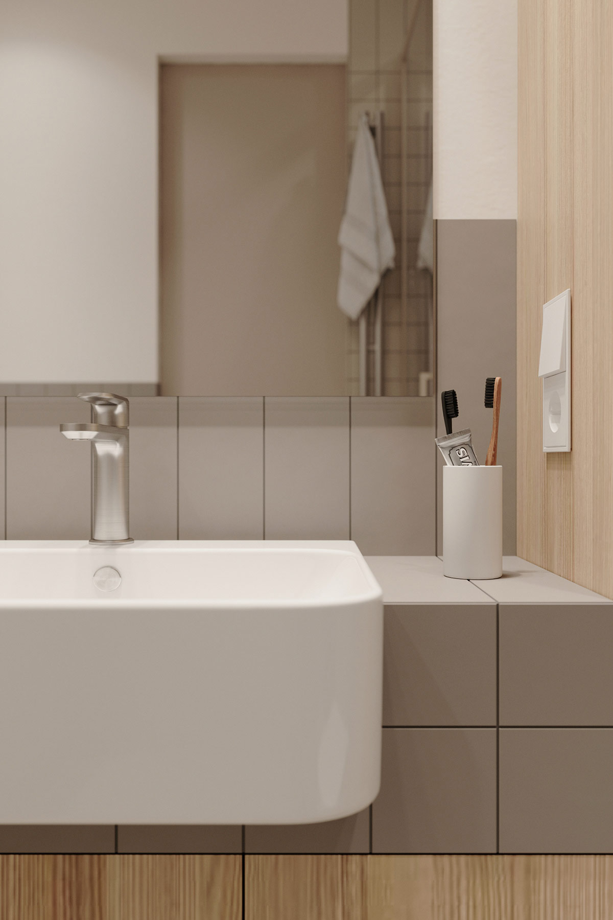 匹配的灰色線性瓷磚以垂直方向位于梳妝臺(tái)后擋板區(qū)域。