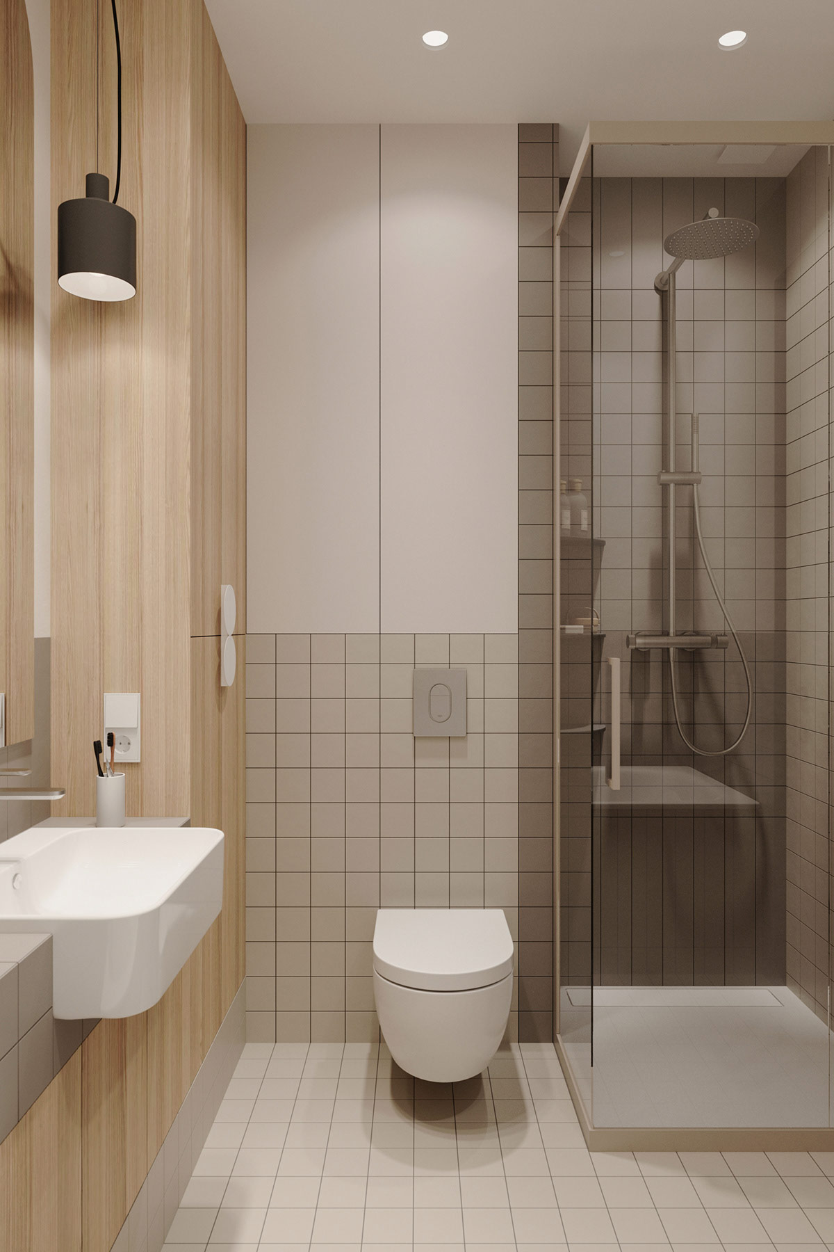 淺灰色瓷磚也填充了地板區(qū)域,還有一個(gè)小淋浴房。