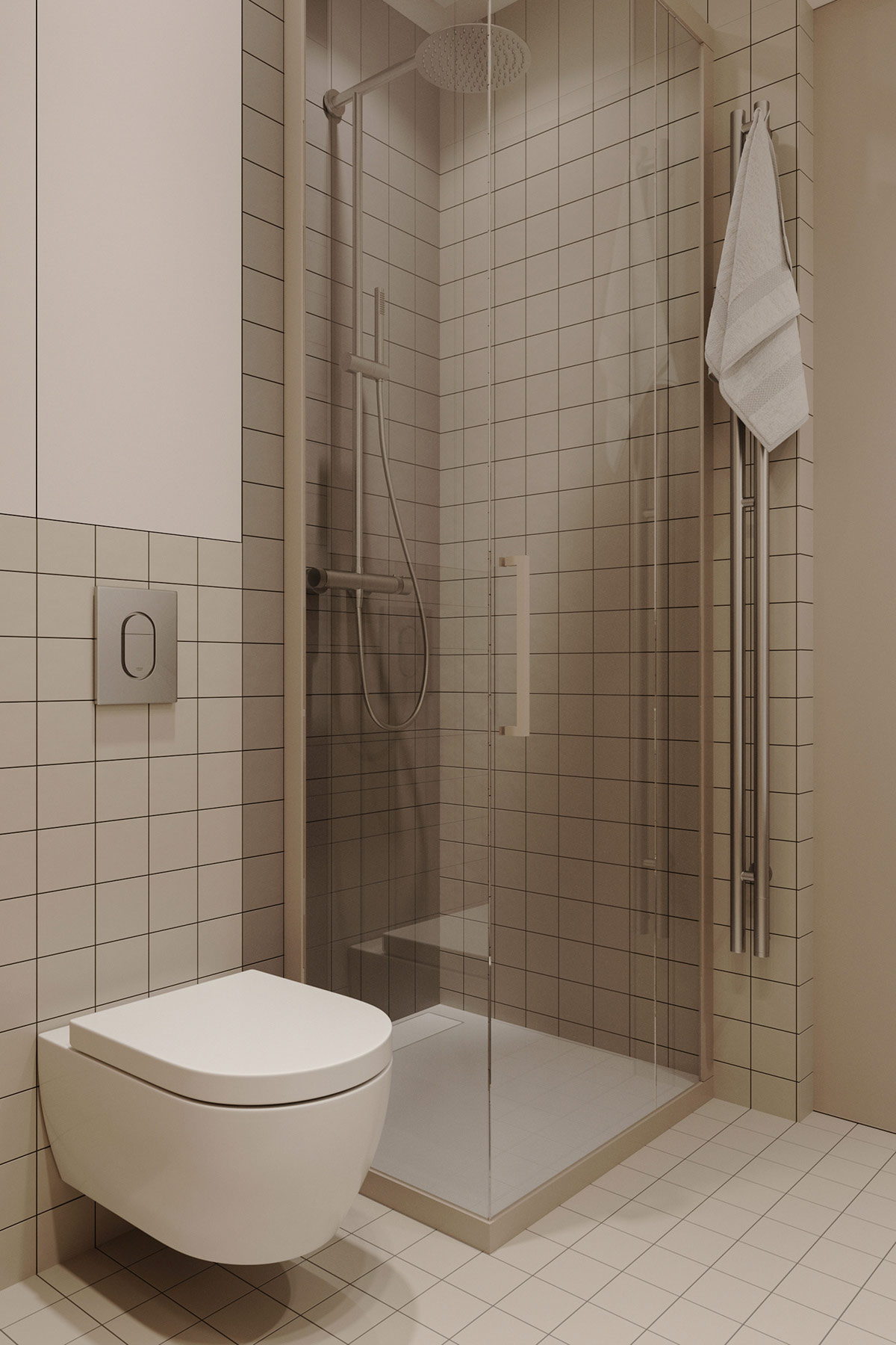 一個(gè)垂直的兩桿毛巾加熱器擠入剩余的狹窄墻壁空間。
