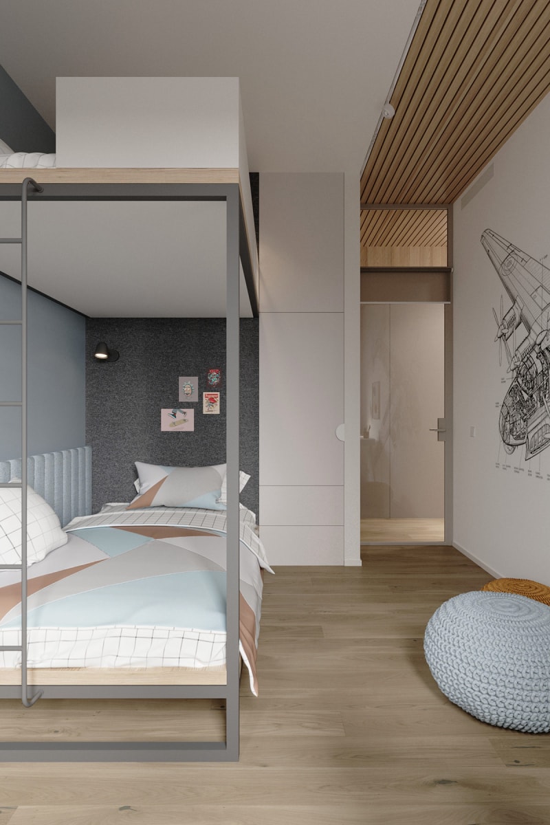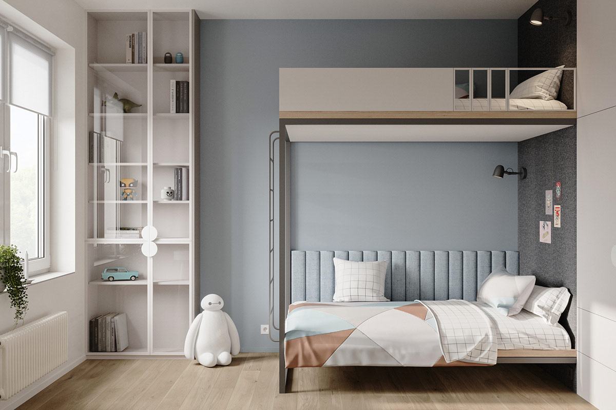 柔和的藍(lán)色油漆和配套的軟墊背板為兒童床營(yíng)造出寧?kù)o的背景。幾何形狀的羽絨被套將所有房間顏色結(jié)合在一起,形成藍(lán)色、棕色、灰色和白色印花。