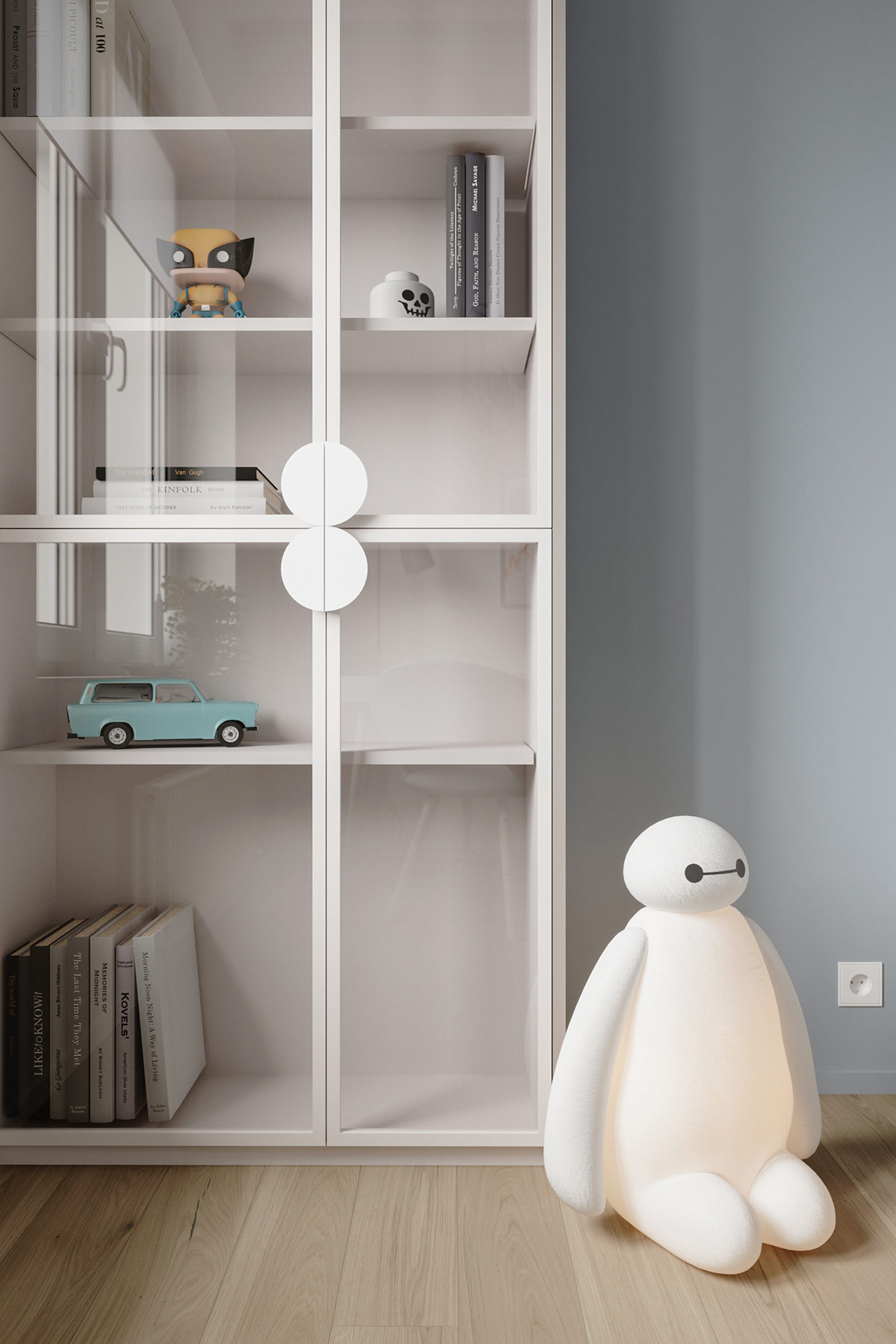 玻璃書(shū)柜可以防止灰塵進(jìn)入兒童圖書(shū)館和特殊收藏品。Baymax 燈發(fā)出友好的光芒。