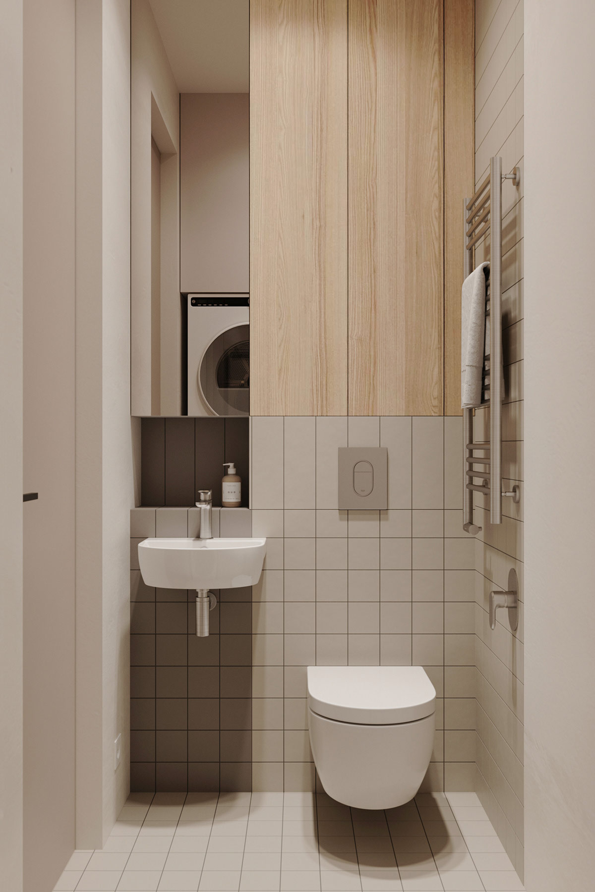 位于家庭入口處的小浴室設(shè)計(jì)遵循與家庭浴室相同的美感,采用淺灰色瓷磚和定制橡木櫥柜。鍍鉻毛巾加熱器會(huì)擦干手巾。