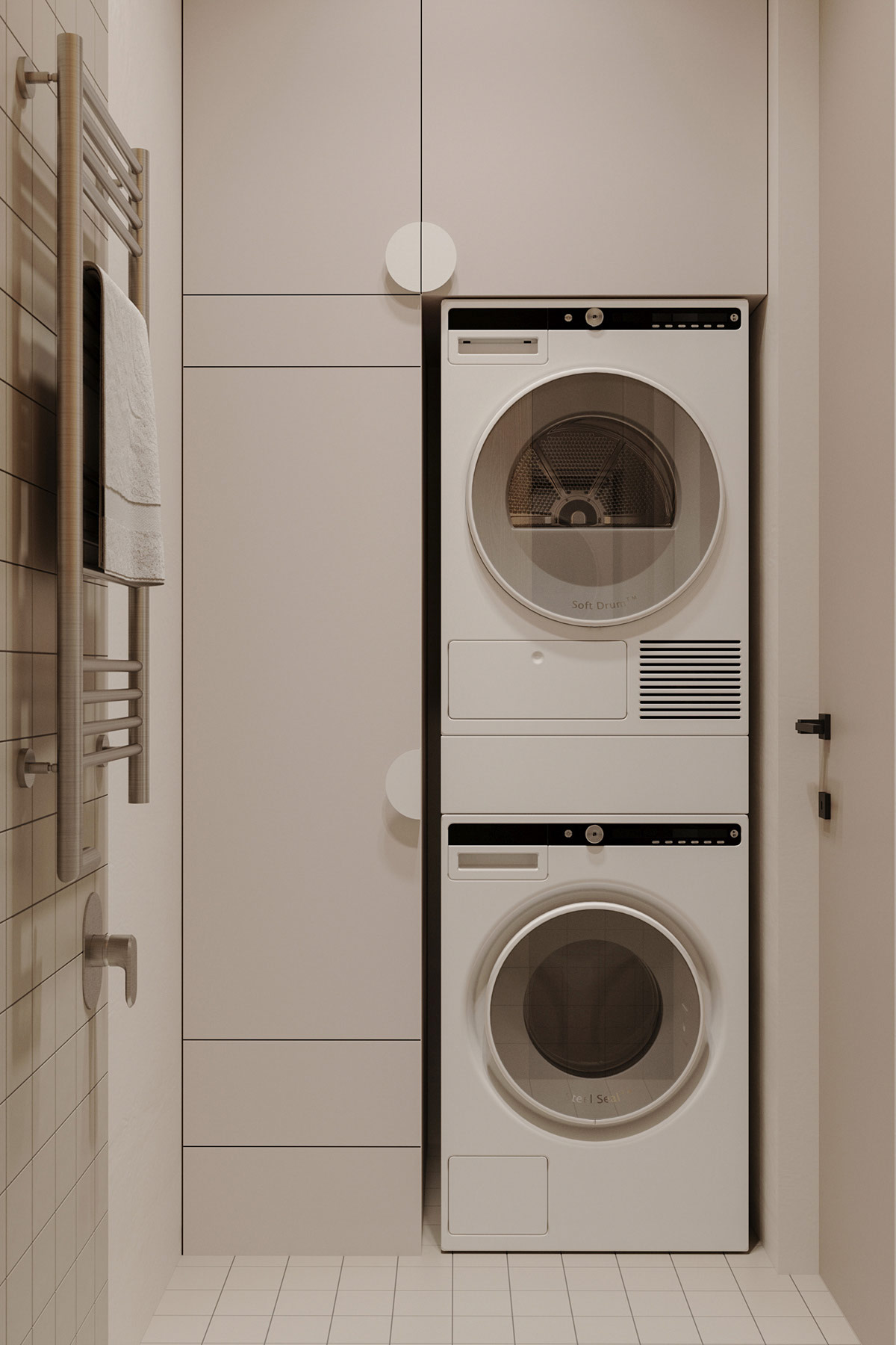 這個(gè)小浴室空間也可用作功能性洗衣房,配有堆疊式洗衣機(jī)和滾筒式烘干機(jī)。一個(gè)高大的存儲(chǔ)單元為洗滌劑、織物柔軟劑和去污產(chǎn)品的強(qiáng)制性軍械庫(kù)提供了充足的空間。