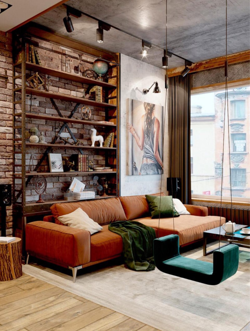 綠色散落的靠墊和相配的地毯與赤褐色沙發(fā)內(nèi)飾形成鮮明對比。黑色的工業(yè)壁燈照亮了藝術(shù)品和原始的混凝土背景。裸露的磚墻支撐著書架。