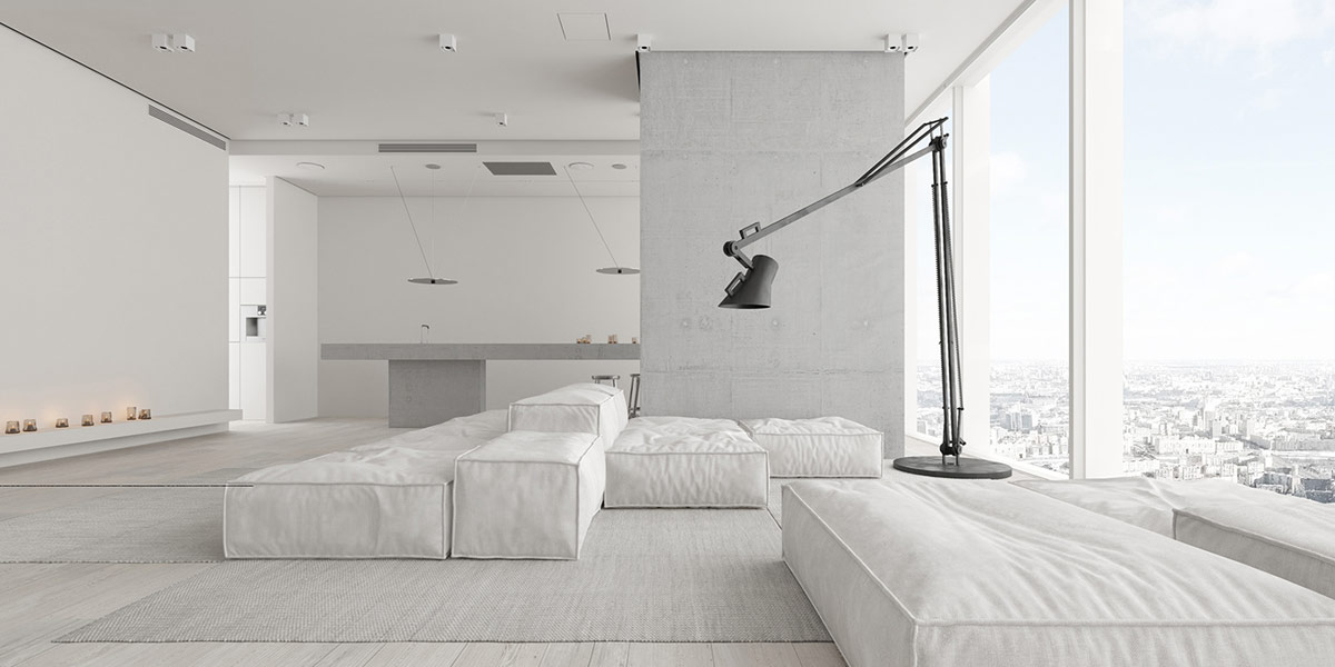 一個全白色的極簡主義客廳靜靜地躺在無邊窗外的一覽無余的城市景觀中。