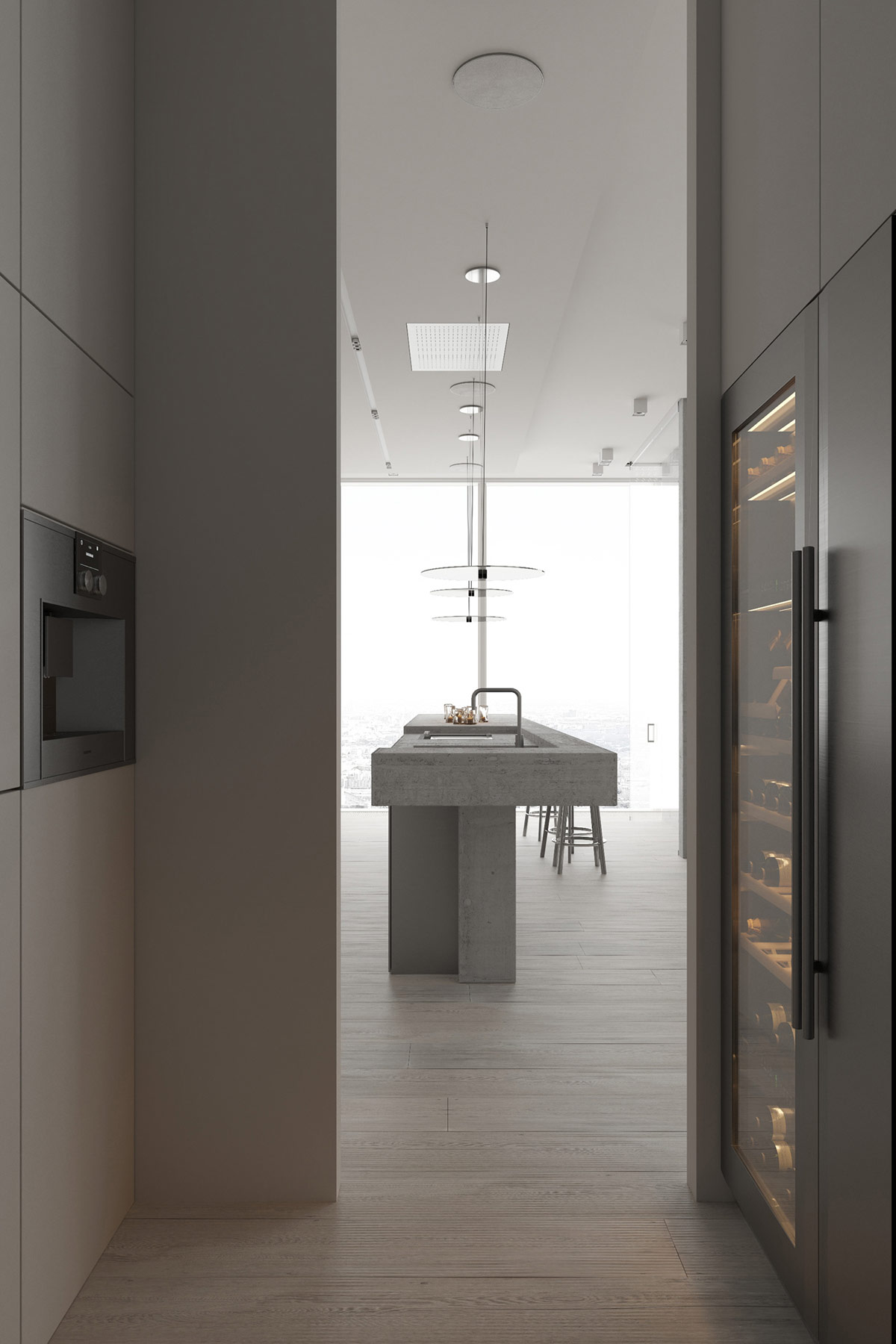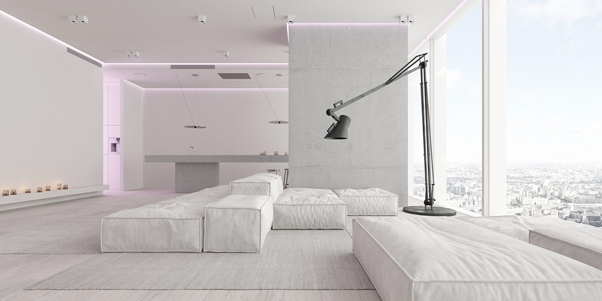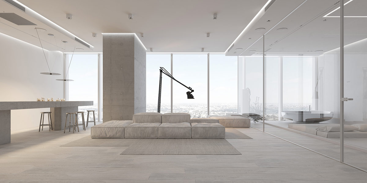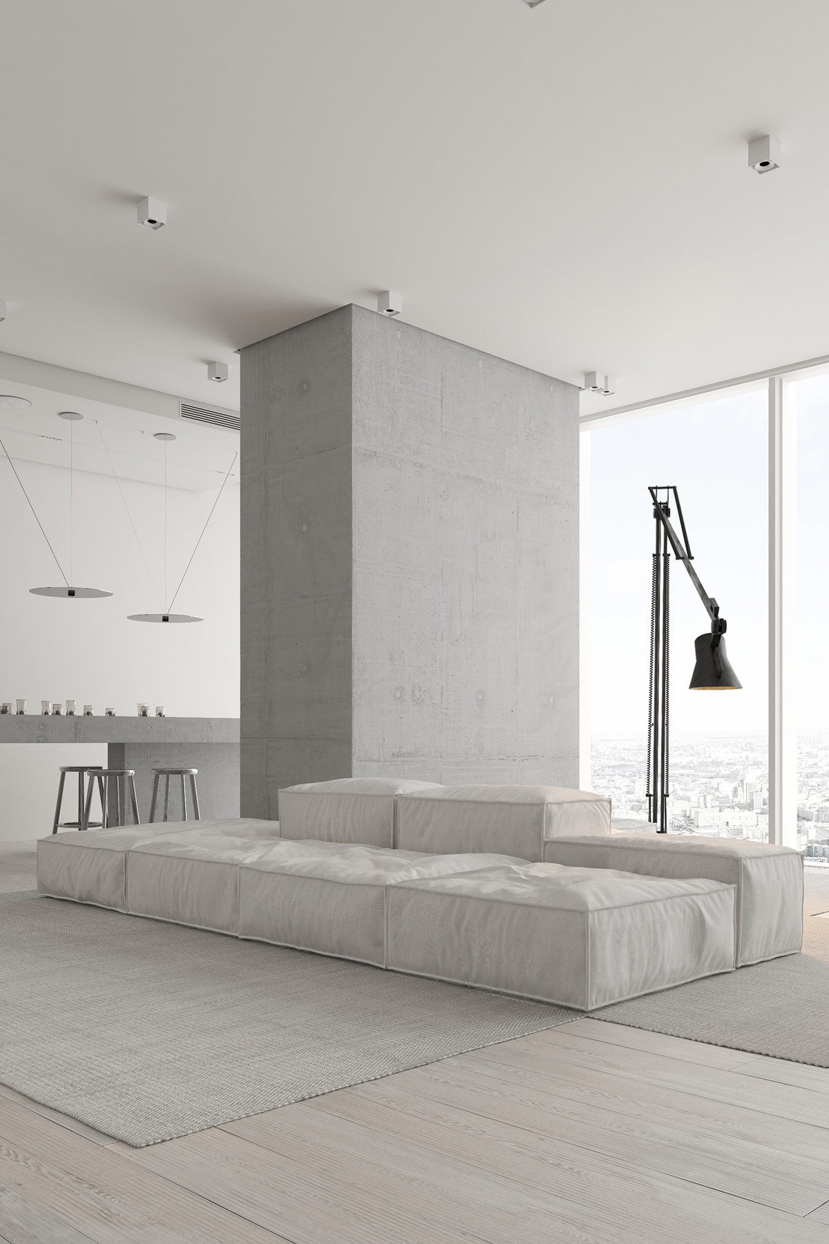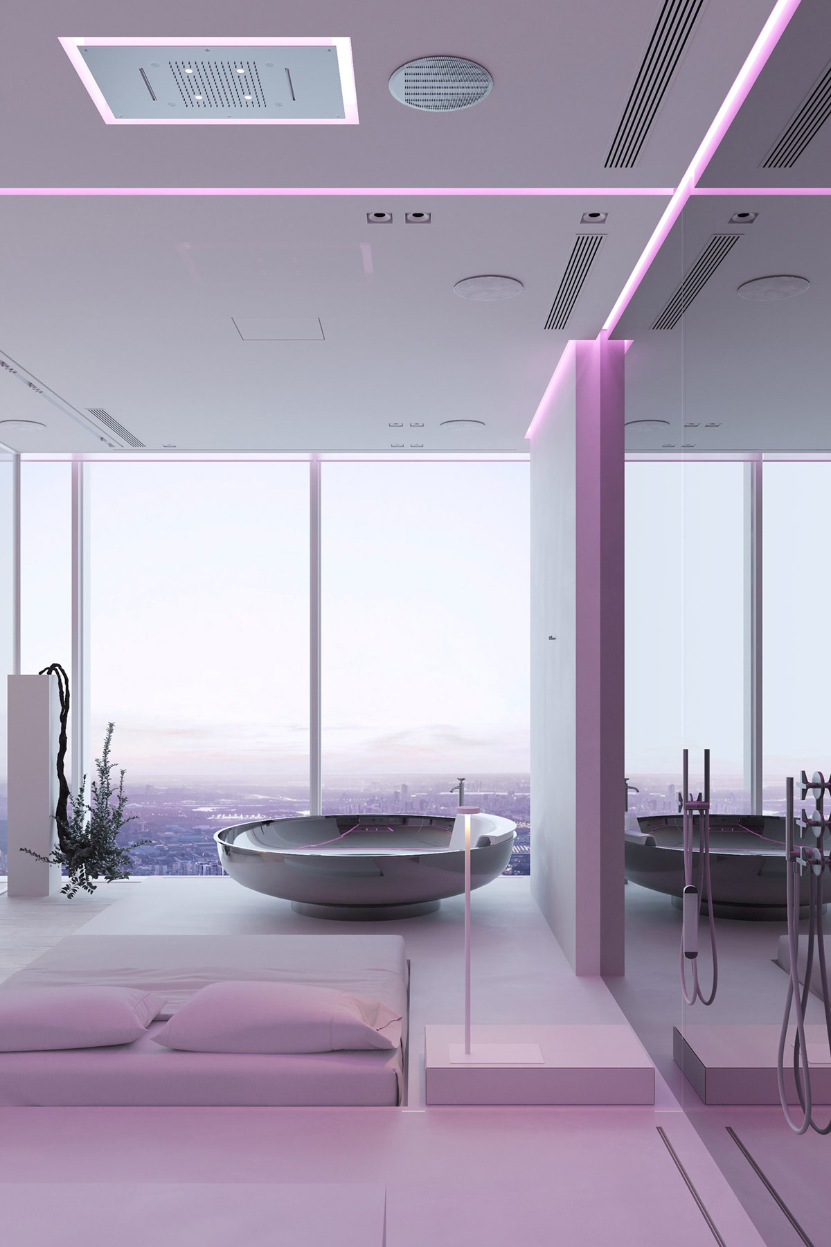 這種簡約而奢華的家居設計在寬敞的開放空間中體現出高端的風格。由伊戈爾·西羅托夫( Igor Sirotov ) 設計的城市閣樓以超大的現代家具為特色,在簡約的布局中展現出重要的個性。五彩繽紛的氛圍燈瞬間改變了純白色的裝飾,不會使空間變得復雜或混亂。原始混凝土元素為現代閣樓內部增添了工業(yè)元素,以抵消顏色和線條的清潔度。臥室及其開放式套間浴室位于奢華的玻璃包裹體中,讓城市全景不間斷地流動。只有衛(wèi)生間和管家的儲藏室隱藏在視野之外,從而營造出一種壯觀的多功能生活體驗。