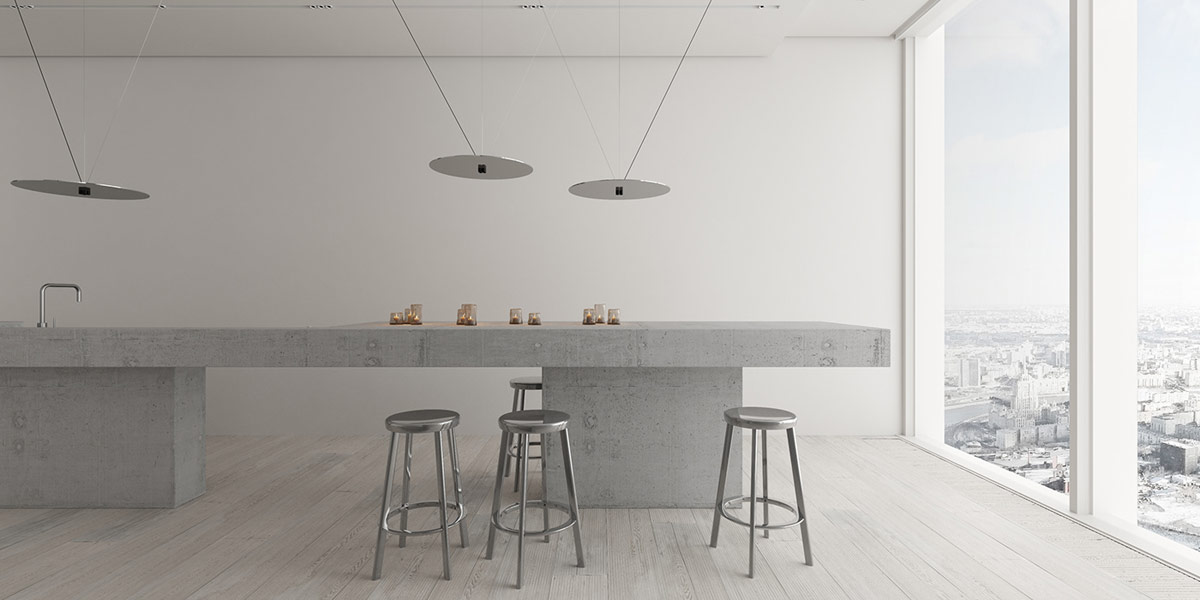 獨特的餐廳吊燈分別懸掛在三根張緊的電纜上,在餐廳吧臺和準備區(qū)營造出醒目而輕便的特色。