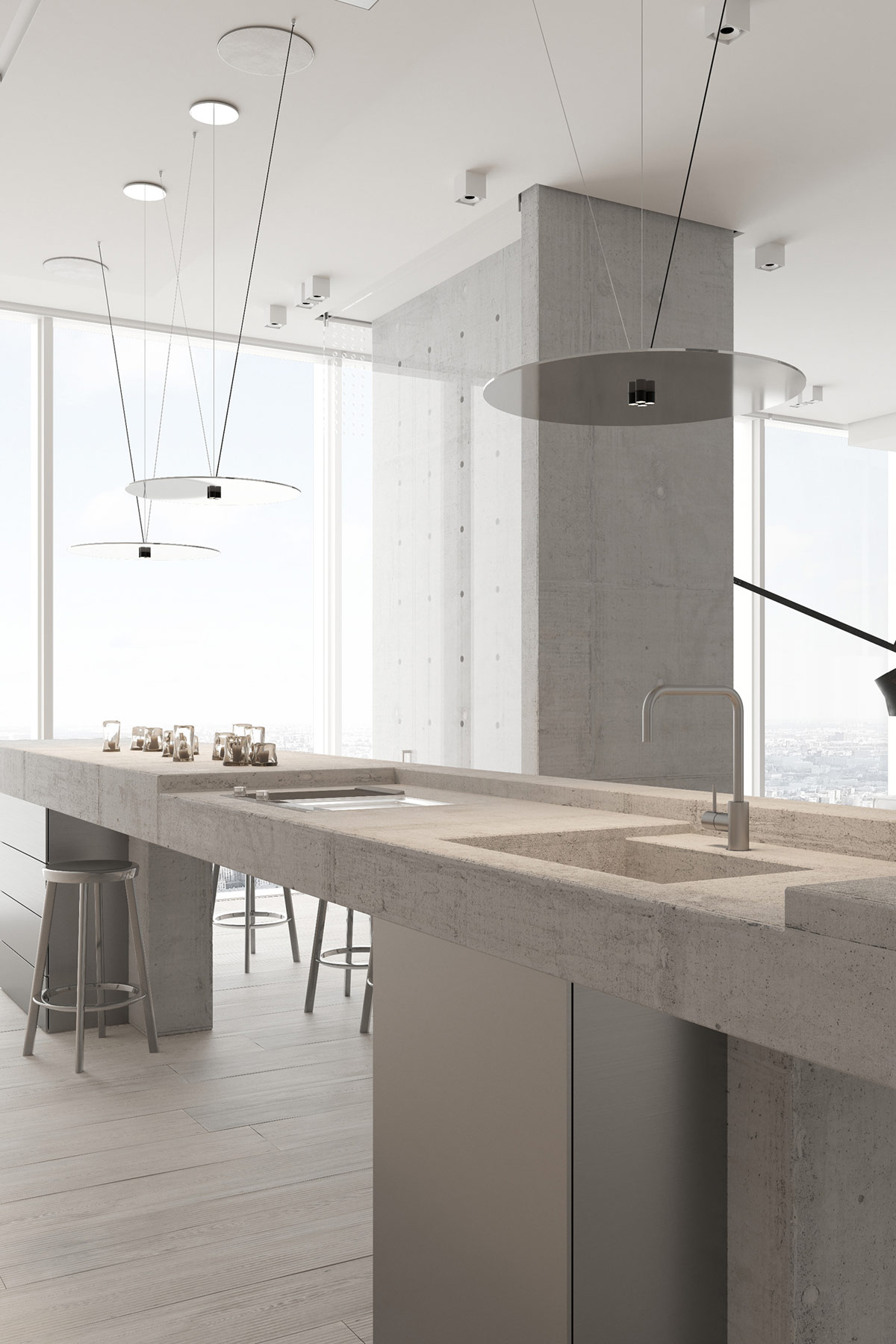 灰色在未加工的混凝土裝飾墻壁和工業(yè)風格的廚房島中浸入更深的陰影。