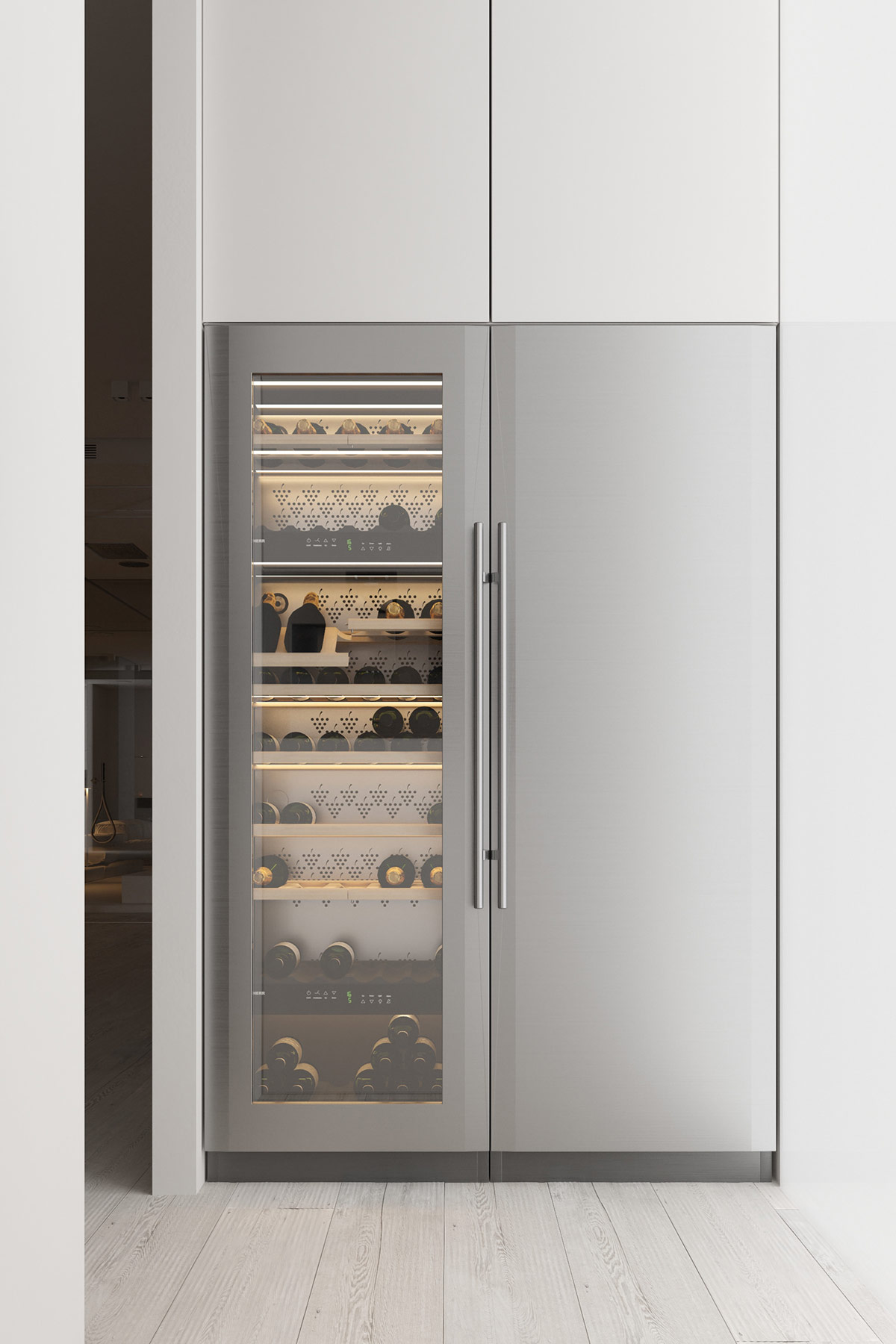 一個玻璃門的葡萄酒儲藏柜有助于選擇晚上的飲料。