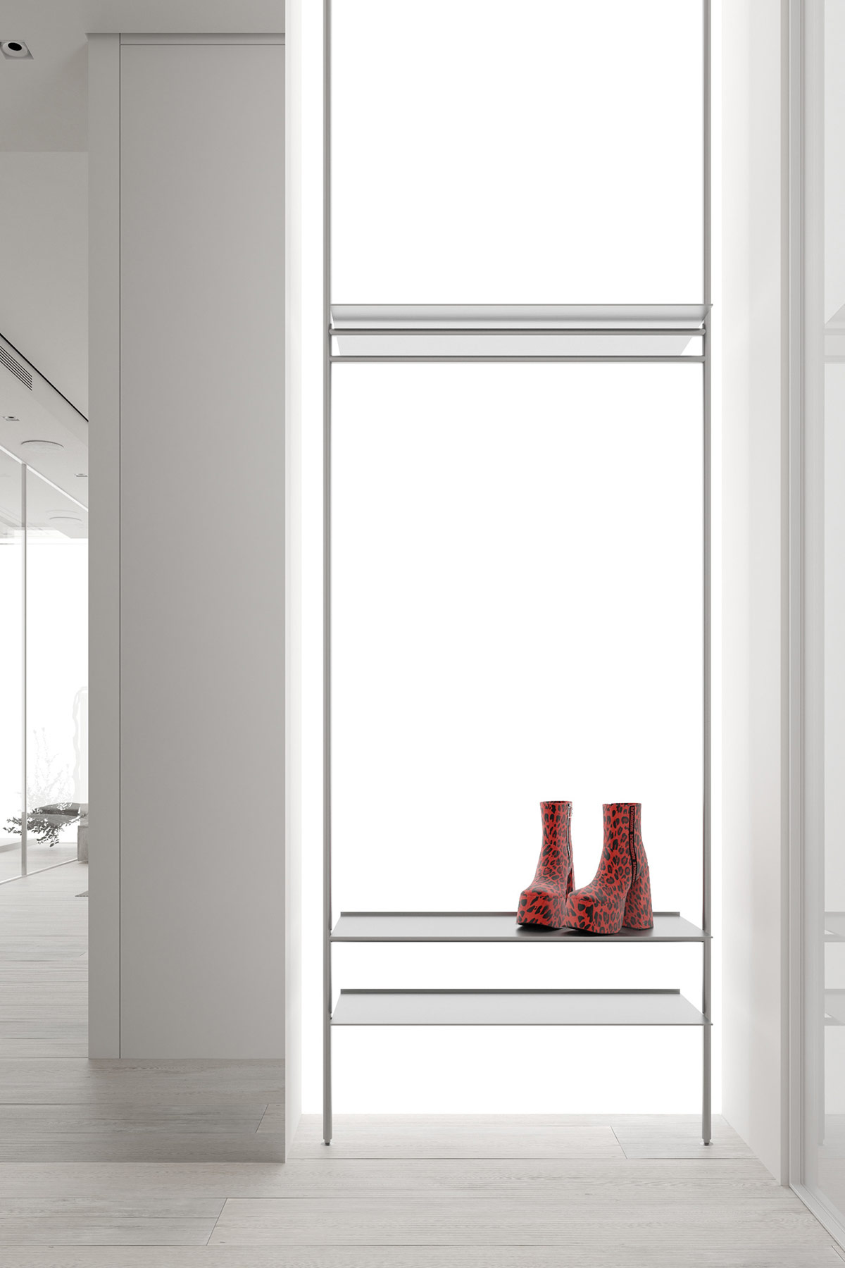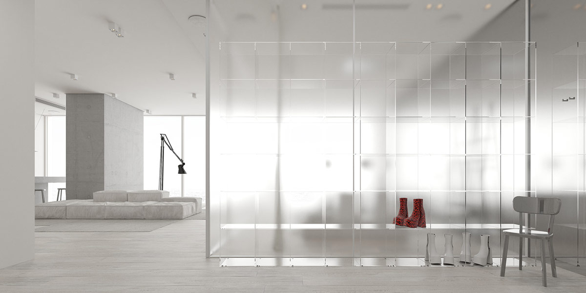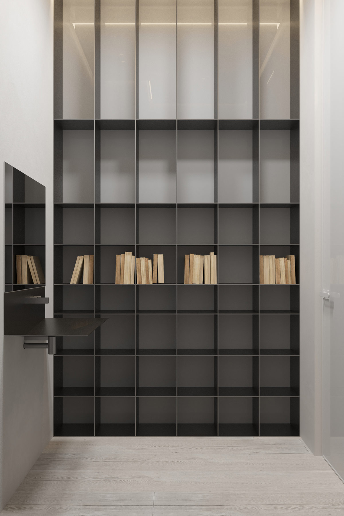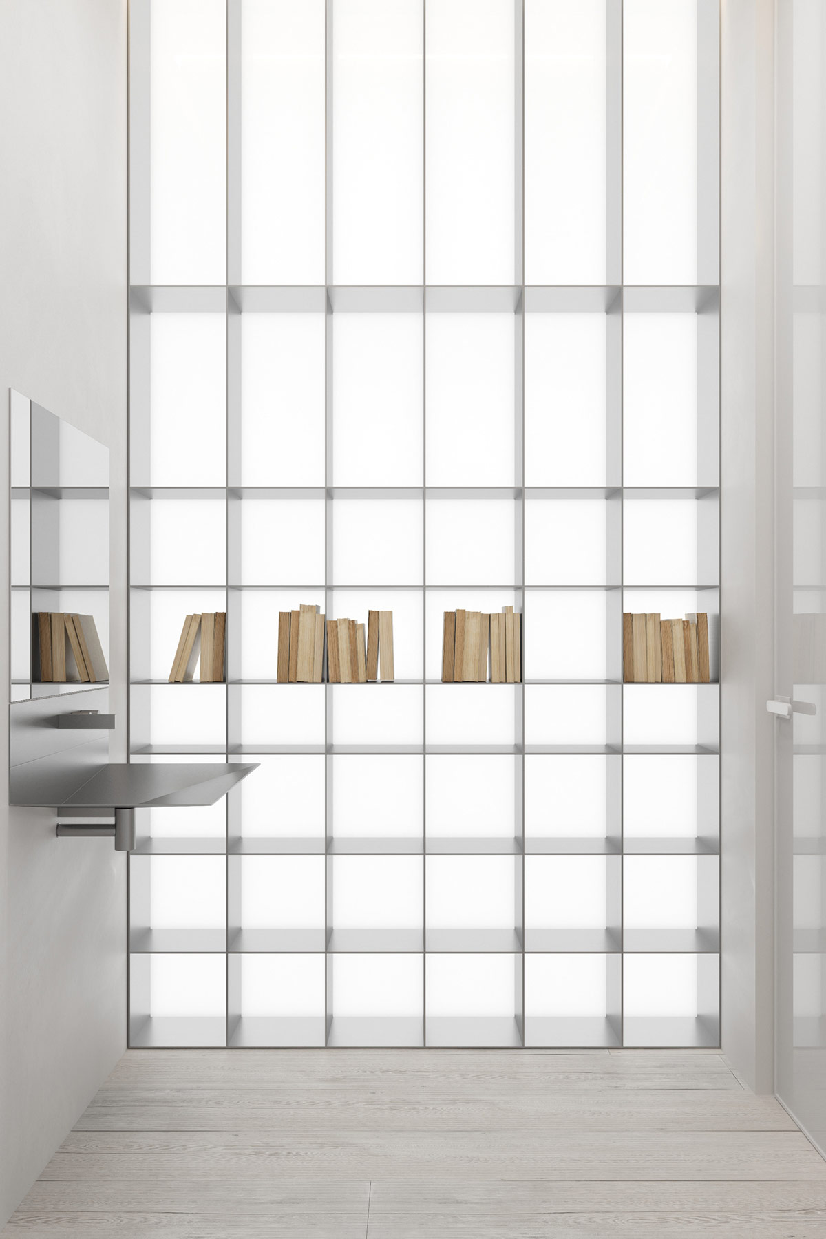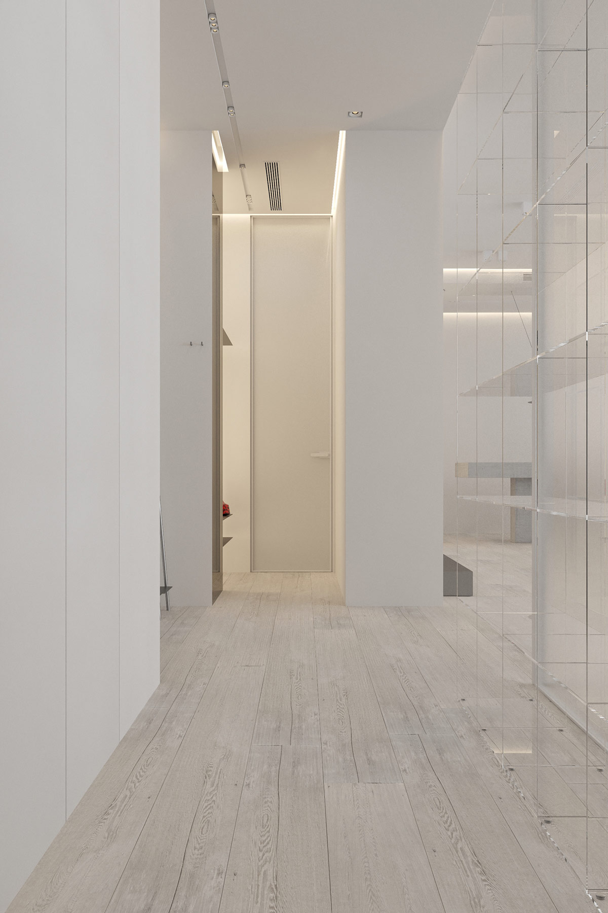 有機玻璃擱架單元巧妙地定義了玻璃墻臥室的入口通道,但允許自然光從上到下泛濫。