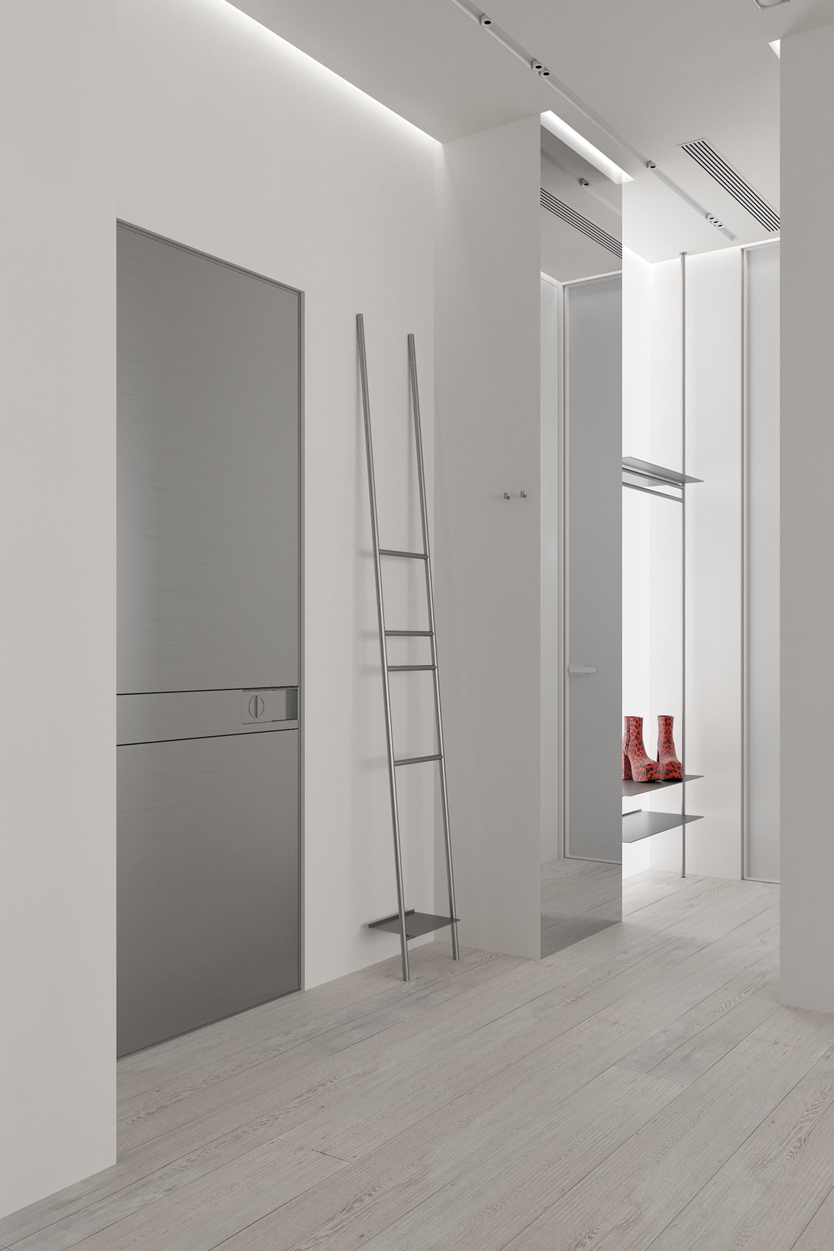 白色無把手衣柜隱藏了房主的服裝系列和戶外外套。