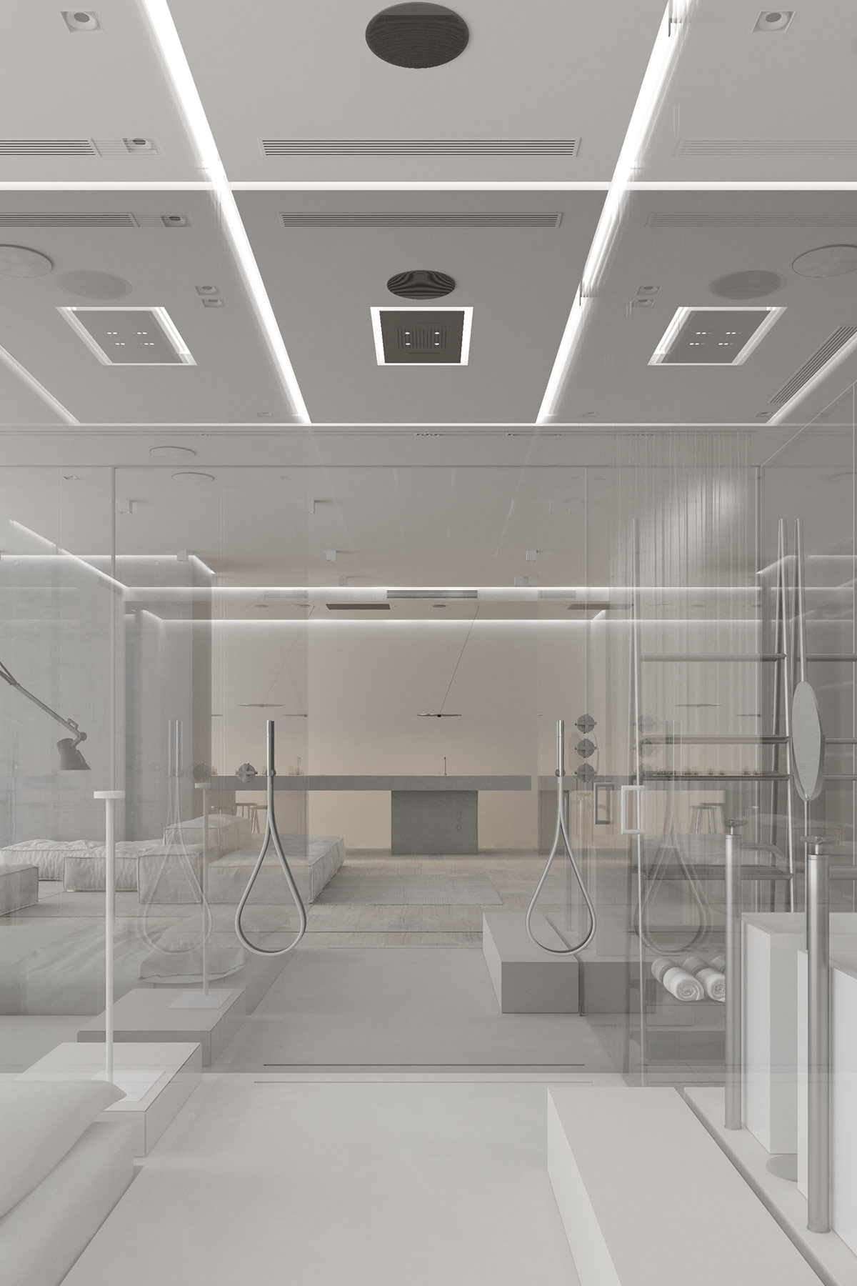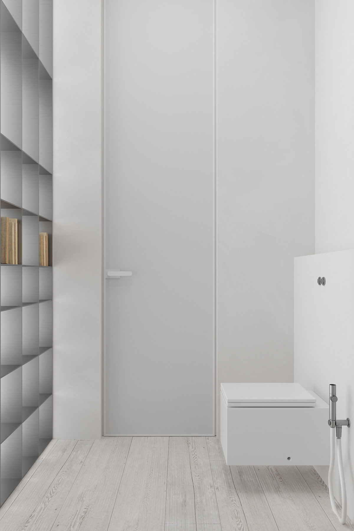 在查看平面圖時,我們能夠看到家中隱藏區(qū)域之間的小空間劃分,即管家的儲藏室和僅在家門口的衛(wèi)生間。寬敞公寓的其余部分在視覺上保持開放和連接,只有透明的玻璃區(qū)域。