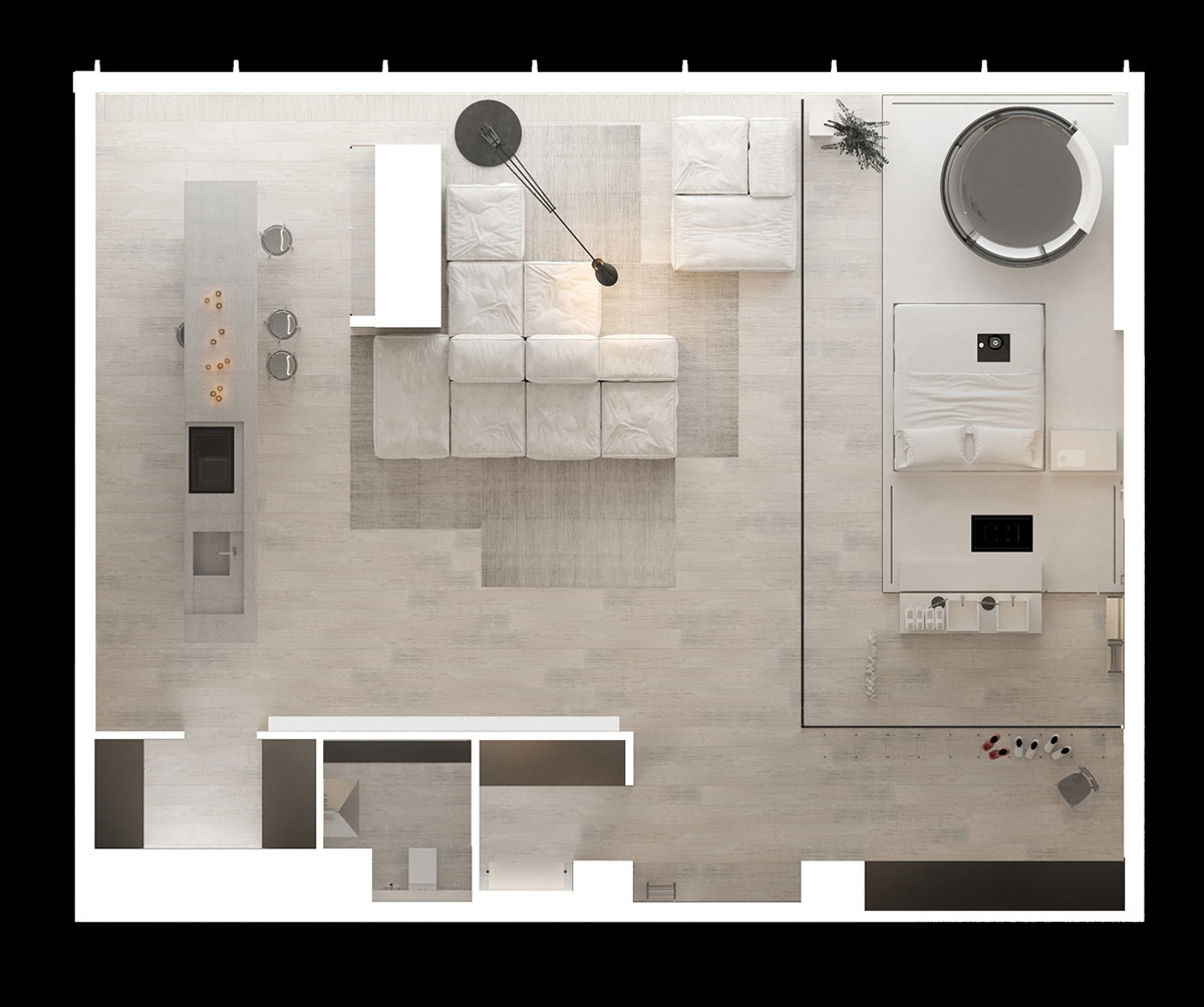 臥室、套間和開放式概念起居空間的每個區(qū)域都可以從旁邊看到。使用時,套間周圍會畫一個簡單的白色隱私窗簾。