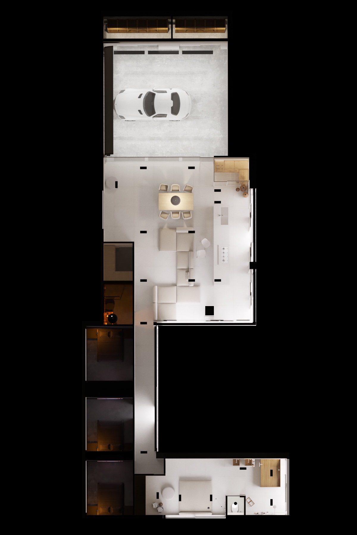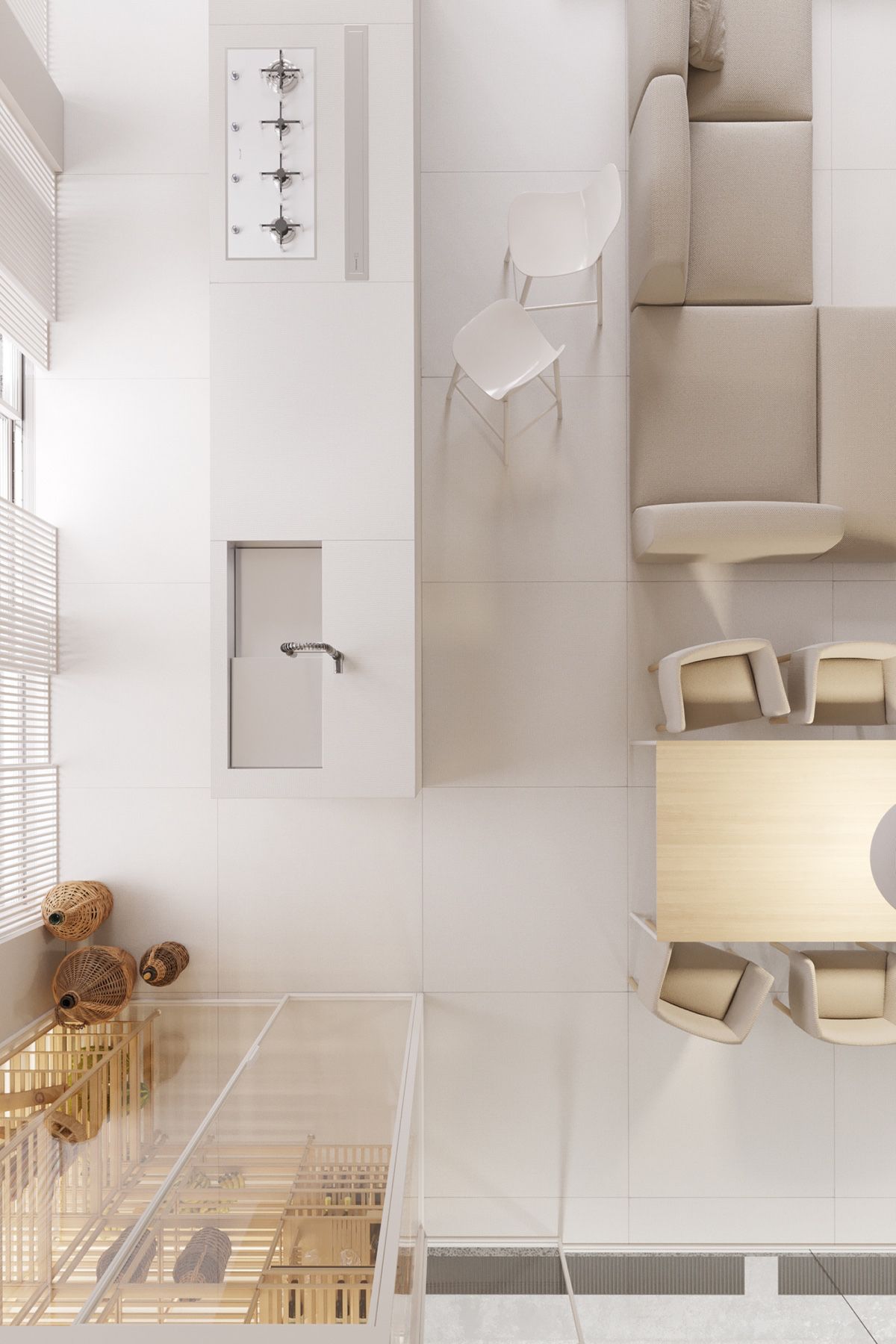 從這張俯視圖,我們可以看到以極簡風(fēng)格為特征的井然有序。一切都有其位置,但房間看起來并沒有脫節(jié)和不匹配。