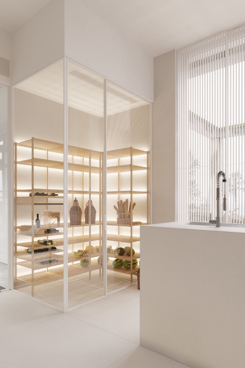 由于木架子和精心布置的照明,食品儲藏室成為家庭設(shè)計的一部分。角落照亮了房間,讓您在需要時輕松找到所需的東西。