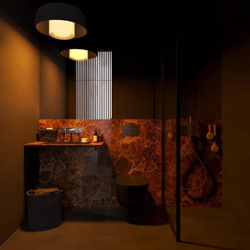 主浴室反映了臥室較暗的內(nèi)部。大理石瓷磚打斷了深色配色方案,看起來很迷人。玻璃隔間淋浴間保持空間整潔,并提供不間斷的地板視圖,給人一種更大的地板空間的錯覺。一個古老的設(shè)計技巧在這里完美展示。
