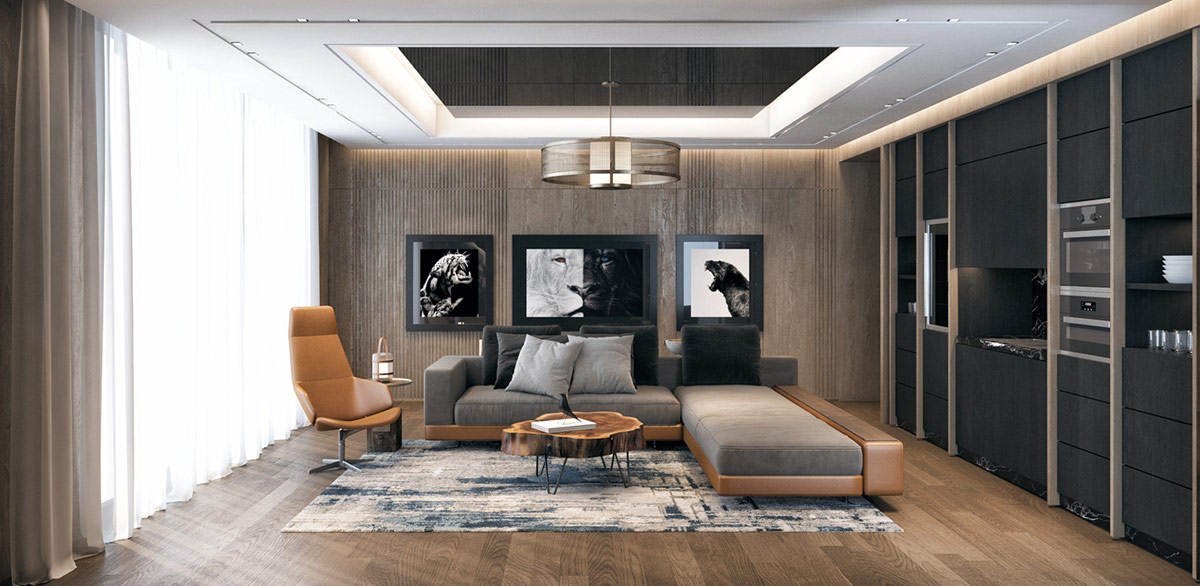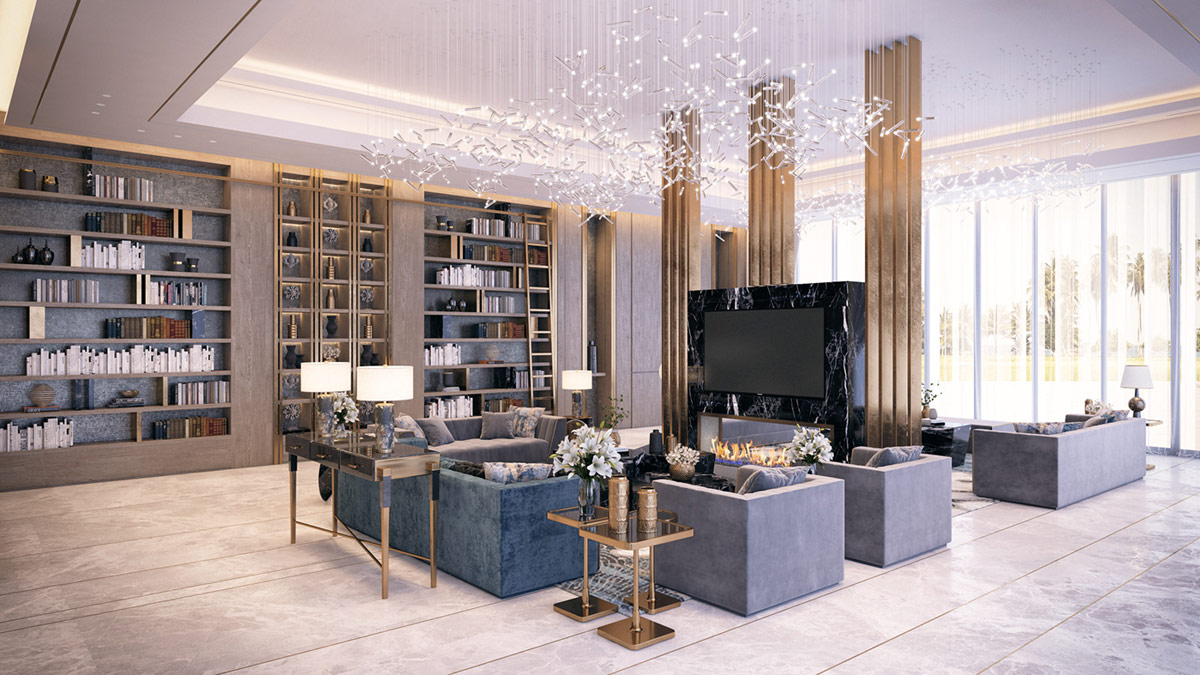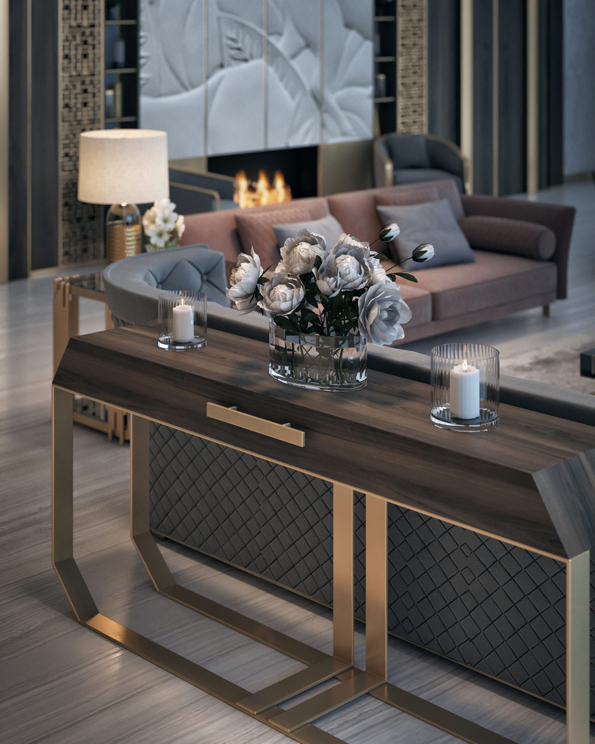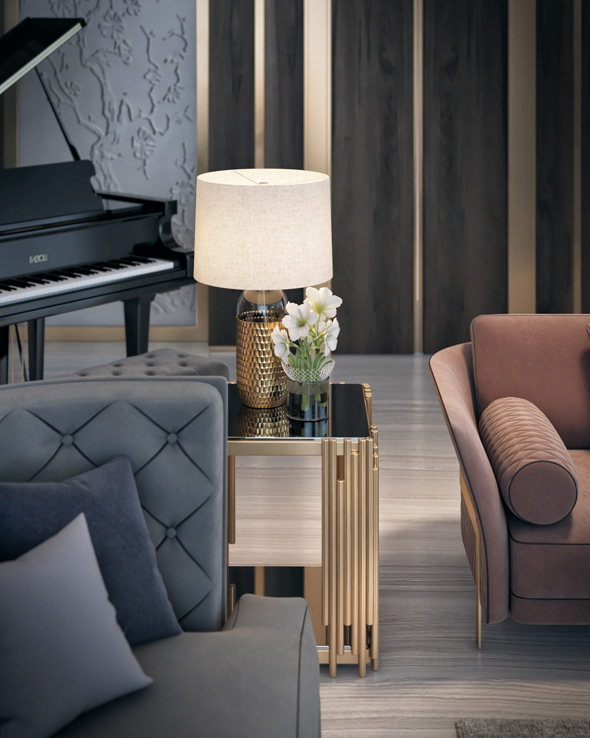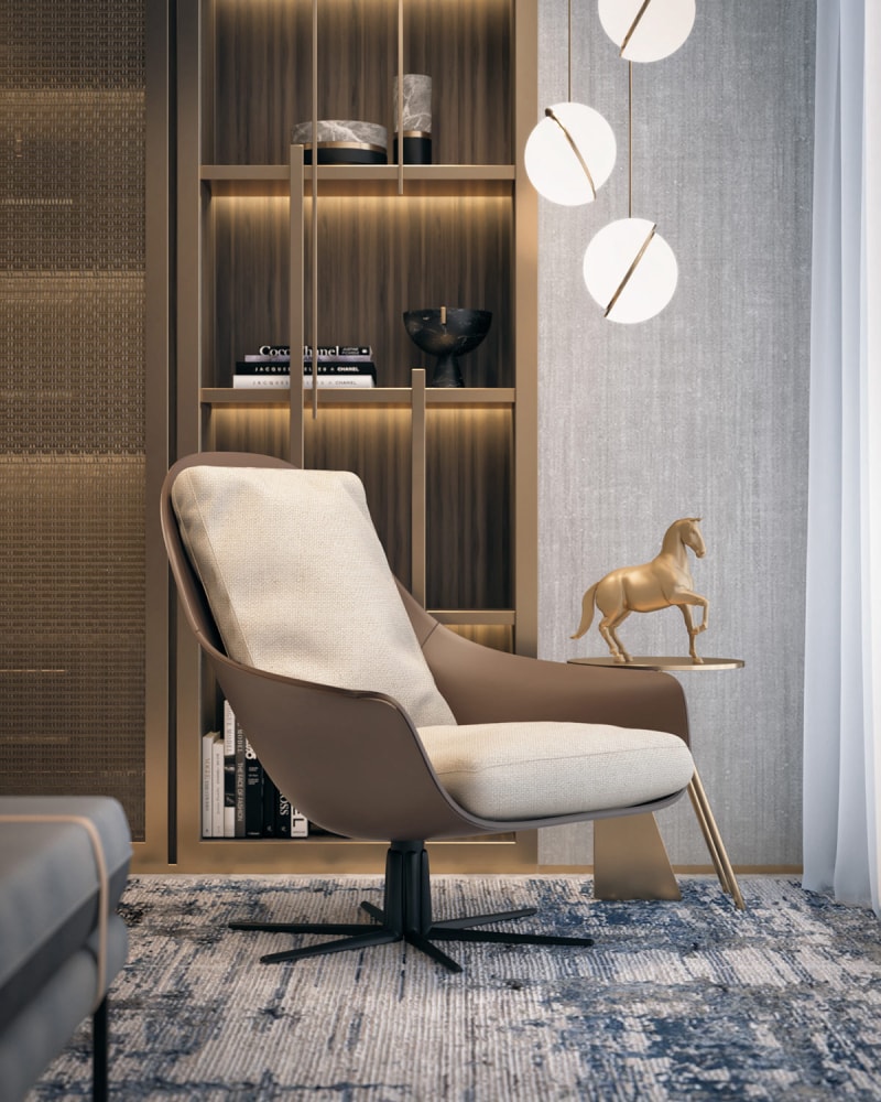 我們?cè)谏程匕⒗_(kāi)始了我們的第一次家庭室內(nèi)之旅,在那里,一座豪華別墅由裝飾藝術(shù)風(fēng)格的家具和淺浮雕裝飾板塑造而成。一盞巨大的現(xiàn)代吊燈將金色的羊群從整個(gè)休息區(qū)上方飛過(guò)。金色的口音貫穿整個(gè)平面圖,為裝飾方案增添了光彩。