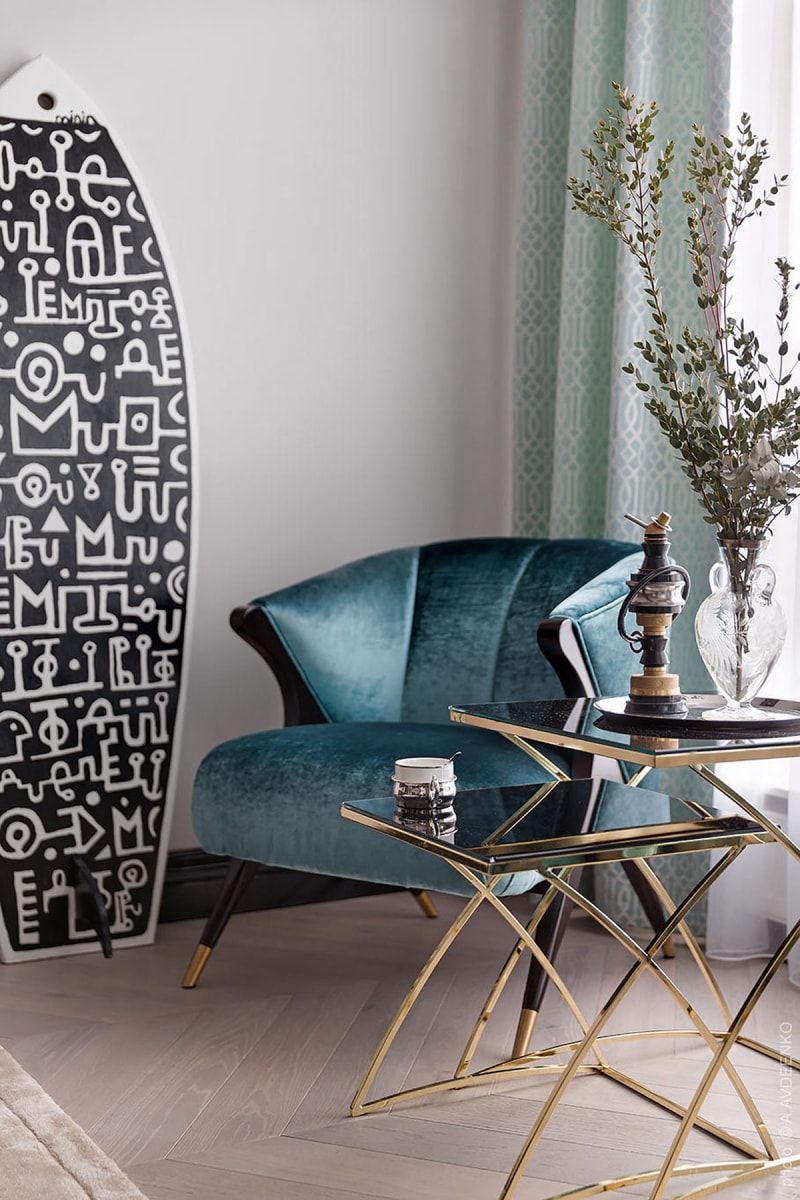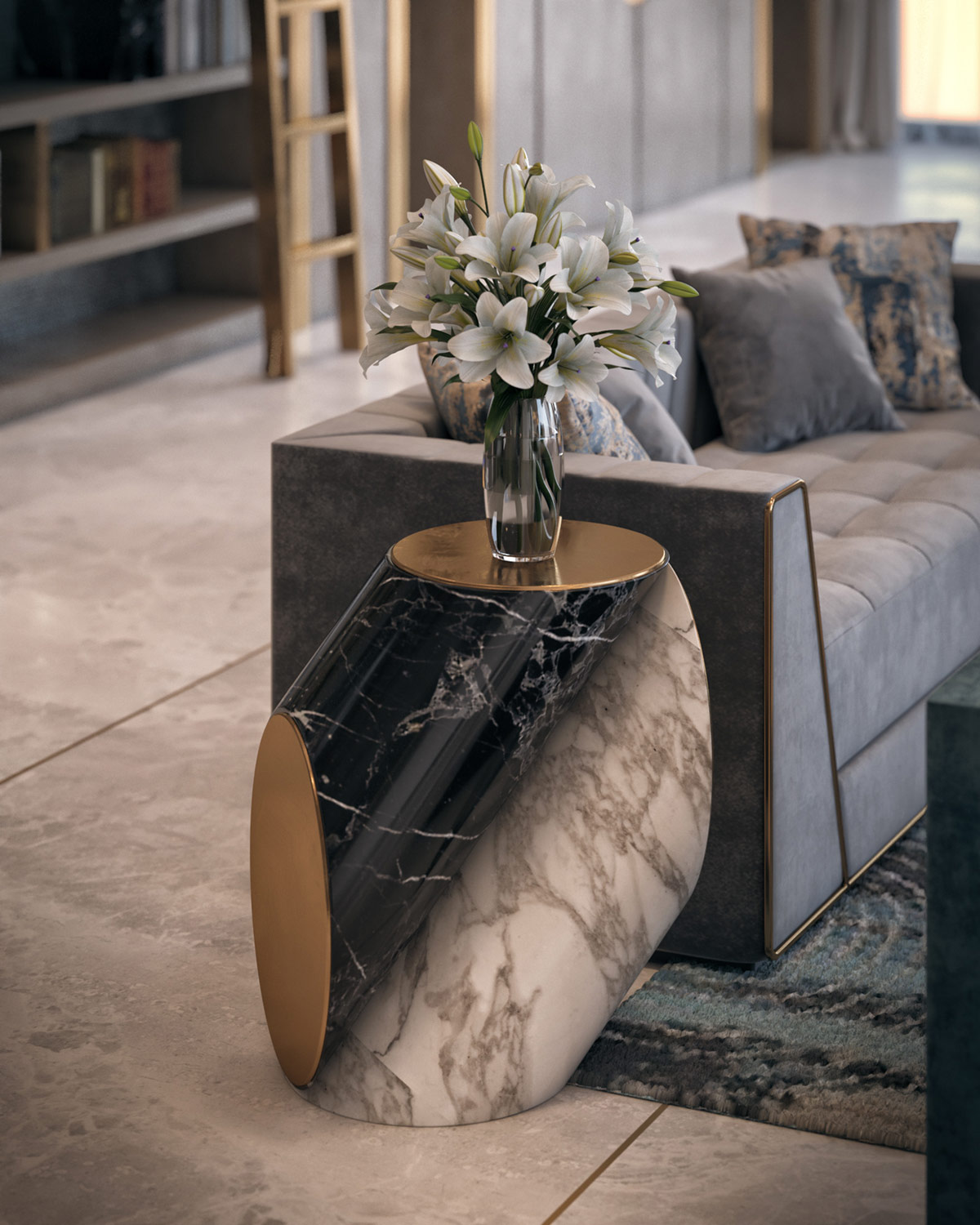 獨(dú)特的茶幾為休閑家具布置增添了曲線,以及一些溫暖的黃銅閃光,以配合優(yōu)雅的黃銅沙發(fā)裝飾。