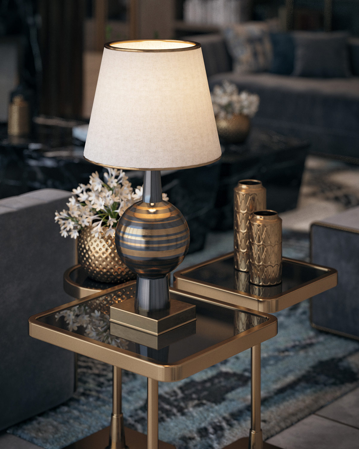 黃銅邊桌坐落在休息室布局周圍的每個(gè)角落。過(guò)多的小邊桌讓任何一個(gè)座位都可以方便地放下飲料,也沒(méi)有一個(gè)角落沒(méi)有豐富的精美裝飾配件展示。