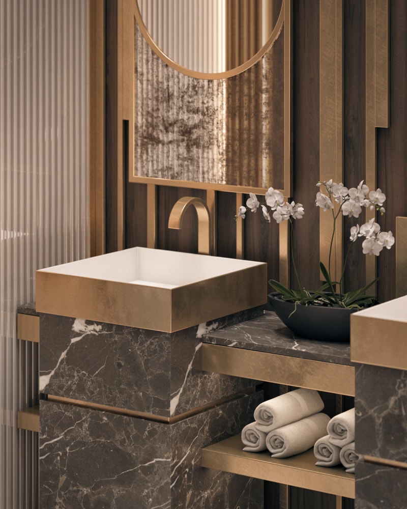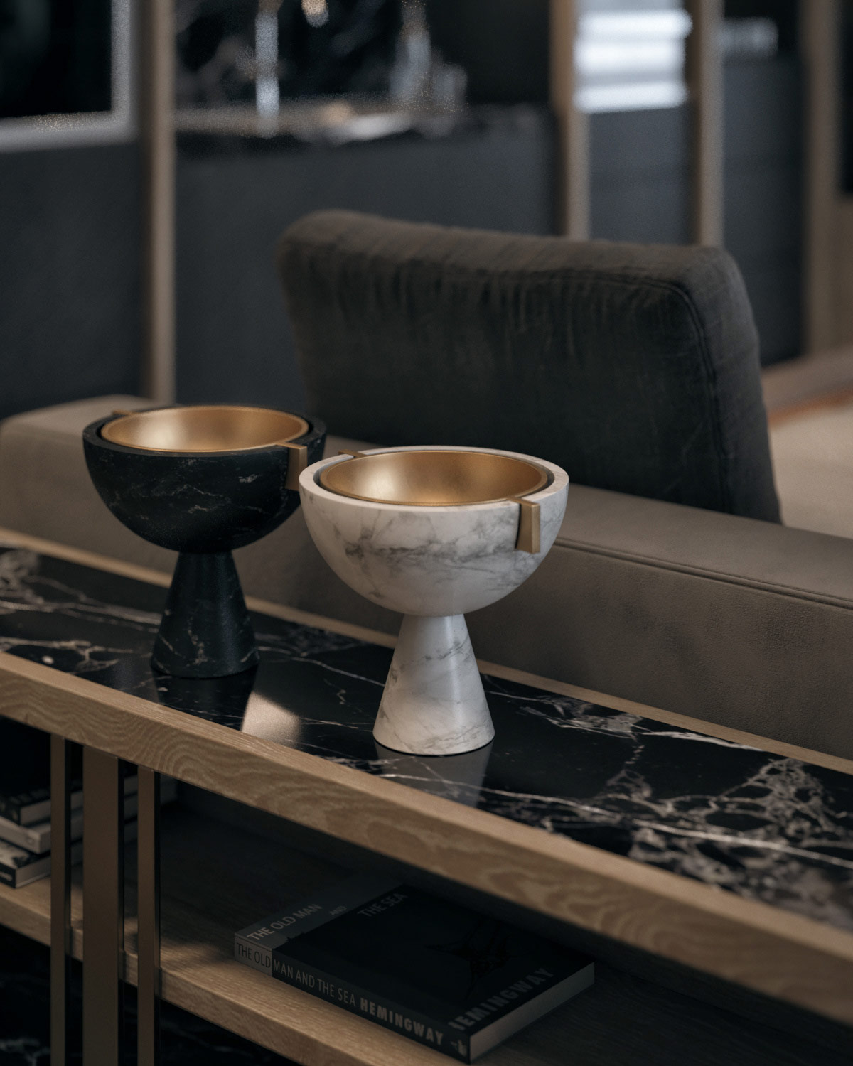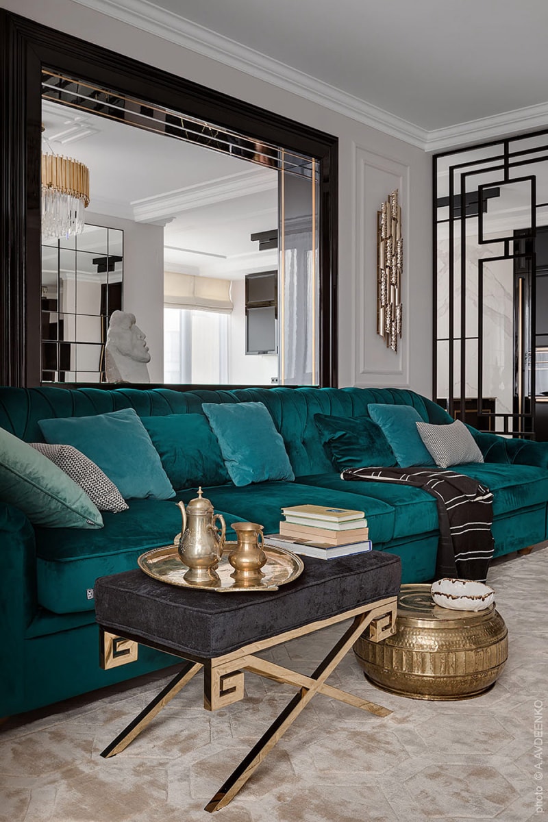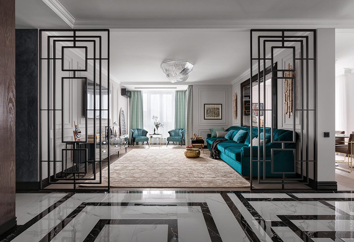 優(yōu)雅而精致,裝飾藝術(shù)風(fēng)格在這兩個(gè)豪華家居內(nèi)飾中生機(jī)勃勃。1920 年代和 30 年代的流行設(shè)計(jì)主題與更現(xiàn)代的元素相結(jié)合,創(chuàng)造出充滿活力和魅力的生活空間、臥室和浴室。時(shí)尚的幾何和程式化的形式與別致的大理石鑲嵌工作地板、醒目的裝飾屏風(fēng)和面板墻、引人注目的現(xiàn)代照明裝置和高端家居飾品一起鋪設(shè)了大膽的線條。精致的金色和黃銅色調(diào)在第一居所中大放異彩,而寶石色調(diào)豐富了我們第二間住宅內(nèi)部的高對(duì)比度黑白背景,營(yíng)造出迷人的個(gè)性。