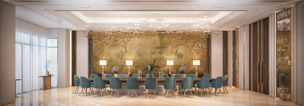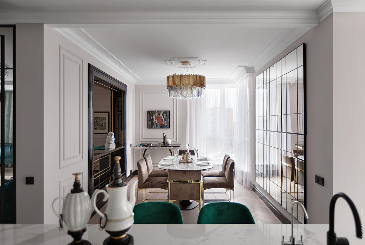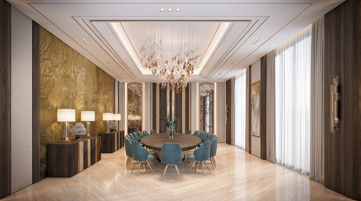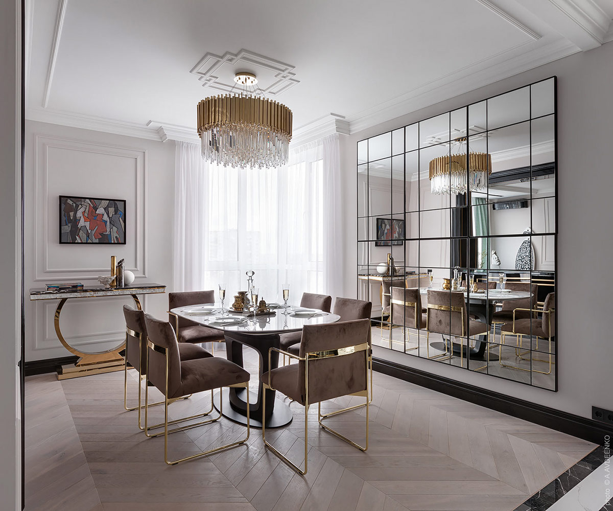 雕塑般的餐廳枝形吊燈在橢圓形桌子上投下金屬色調(diào),而兩對(duì)臺(tái)燈照亮了橫跨金色特色墻的淺浮雕裝飾面板。