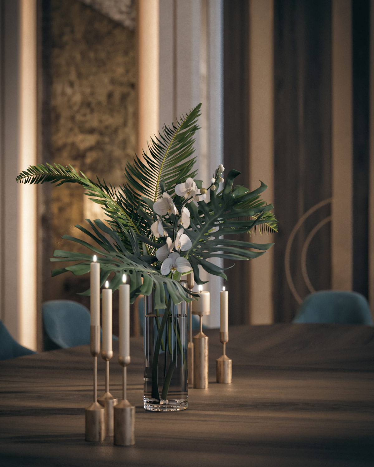 一個(gè)高大的熱帶植物玻璃花瓶和一簇簇燭臺(tái)構(gòu)成了一個(gè)寬松而優(yōu)雅的中心裝飾品。