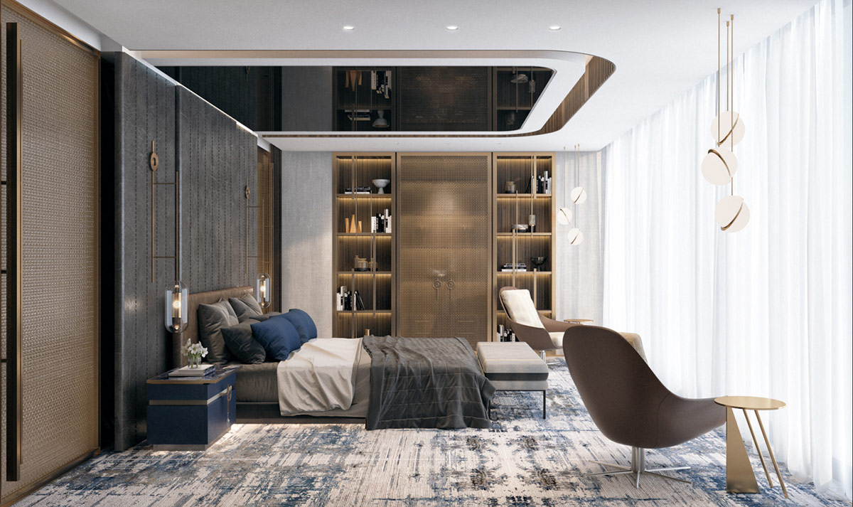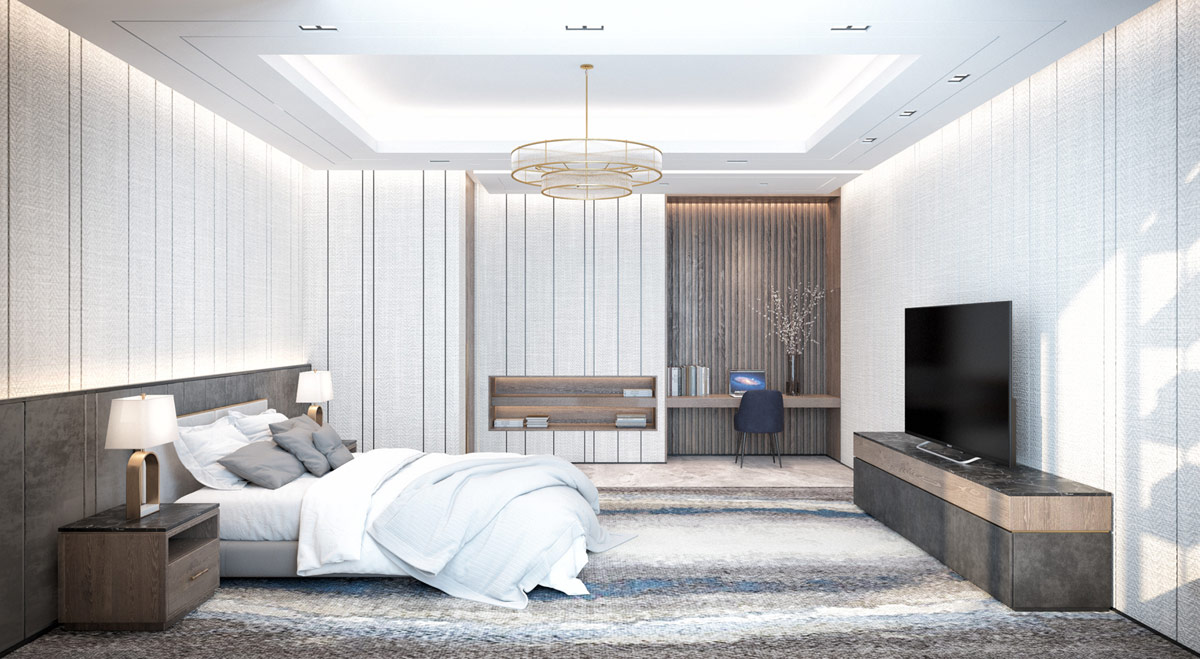 進(jìn)入主臥室,鑲板墻紙巧妙地排列在墻壁上。毛絨臥室地毯在灰色和白色的基礎(chǔ)調(diào)色板上穿出藍(lán)寶石藍(lán)色調(diào)。木制家具為該方案增添了溫暖元素。