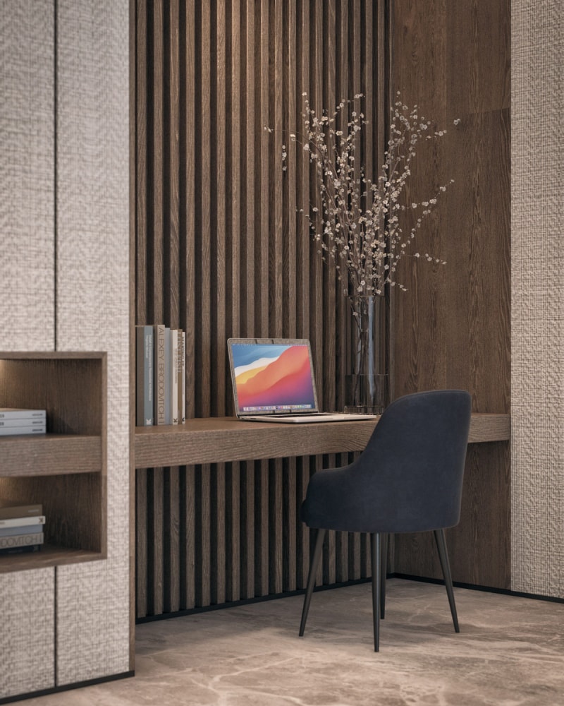 木板條背靠家庭辦公區(qū),營(yíng)造出時(shí)尚質(zhì)感的大膽時(shí)刻。