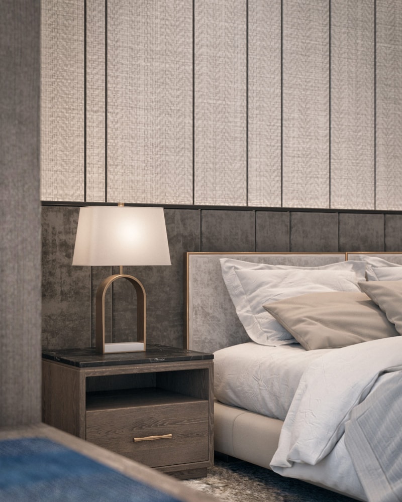 時(shí)尚的拱形圖案融入裝飾藝術(shù)風(fēng)格的幾何線條,并作為時(shí)尚的床頭柜燈出現(xiàn)在臥室設(shè)計(jì)中。