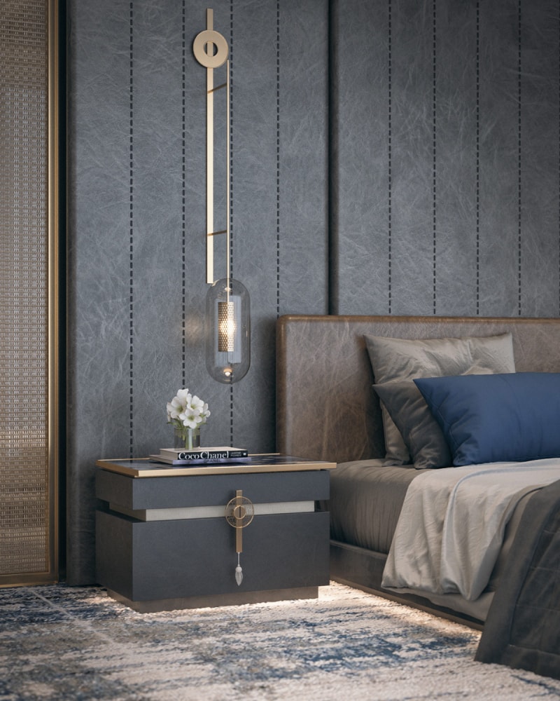 獨(dú)特的壁燈設(shè)置在帶有黃銅裝飾藝術(shù)裝飾的漂亮床頭柜上方。