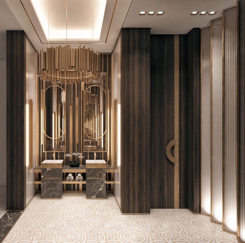 豪華的裝飾藝術(shù)風(fēng)格浴室設(shè)計(jì)超凡脫俗。精美的浴室枝形吊燈后面的雙水槽浴室梳妝臺(tái)區(qū)域飾有黃銅長(zhǎng)笛。衛(wèi)生間在裝飾藝術(shù)風(fēng)格的門(mén)把手后面等待,凹槽玻璃面板滾動(dòng)著反光圖案。