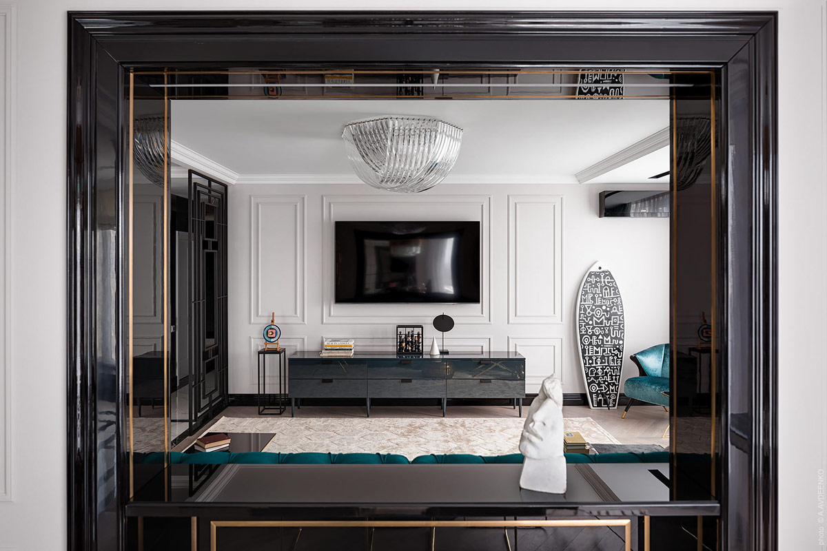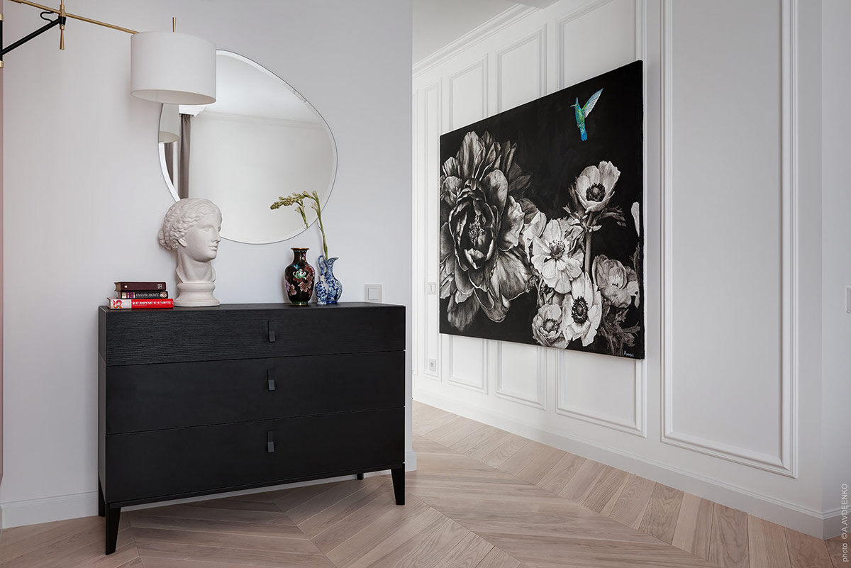 自由形式的裝飾墻鏡為低調(diào)的黑色控制臺(tái)增添了現(xiàn)代氣息。