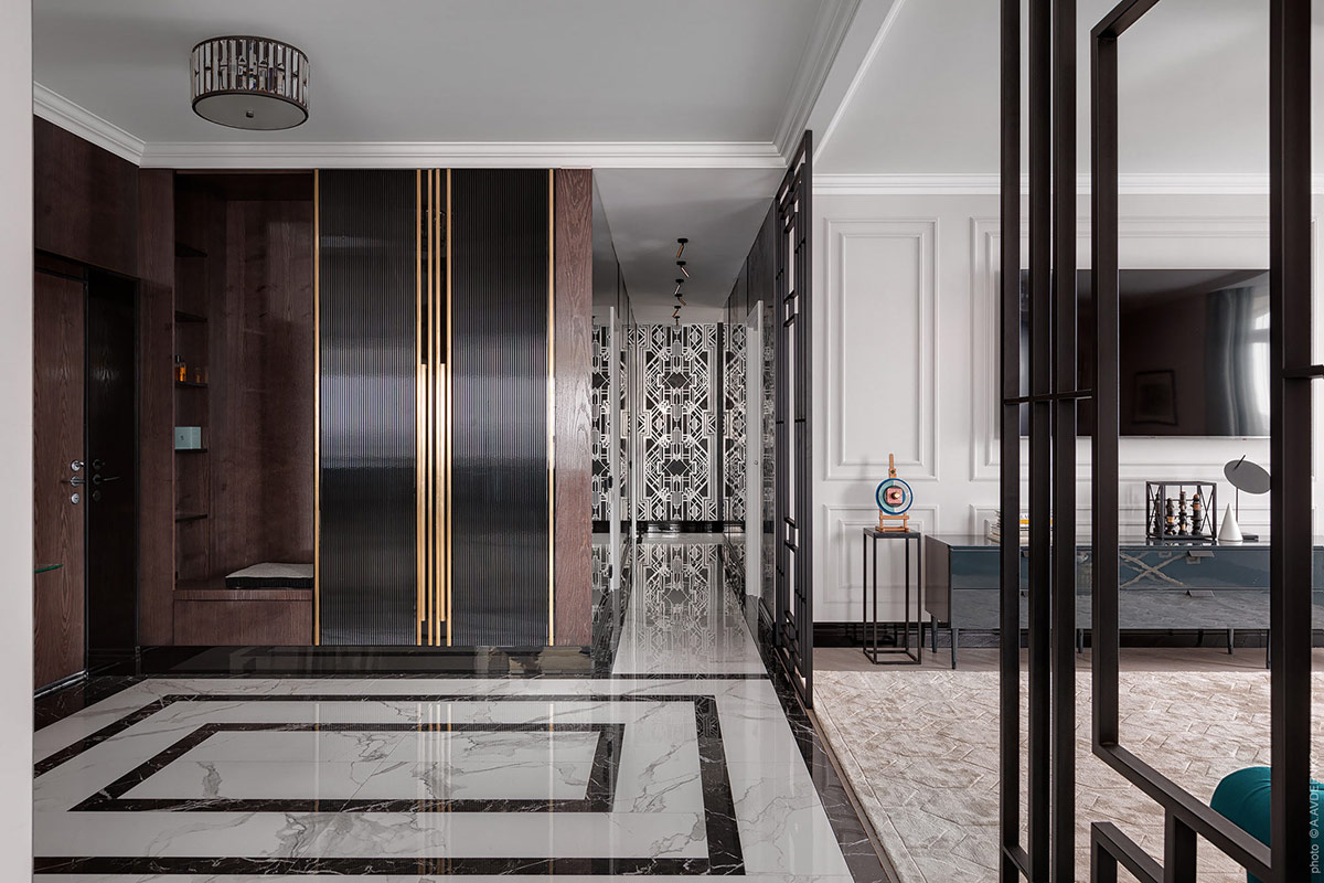 內(nèi)置儲(chǔ)物單元將裝飾藝術(shù)風(fēng)格的凹槽紋理穿過(guò)前入口。