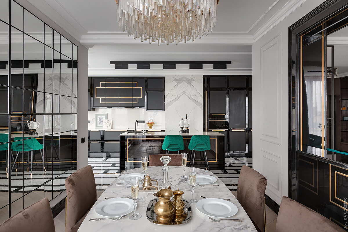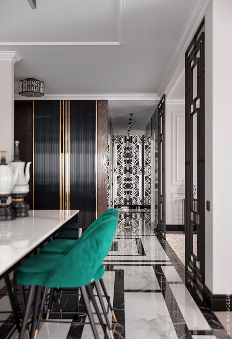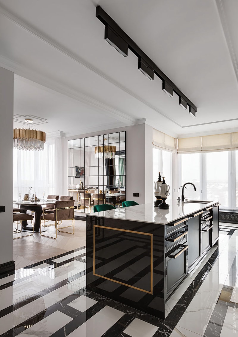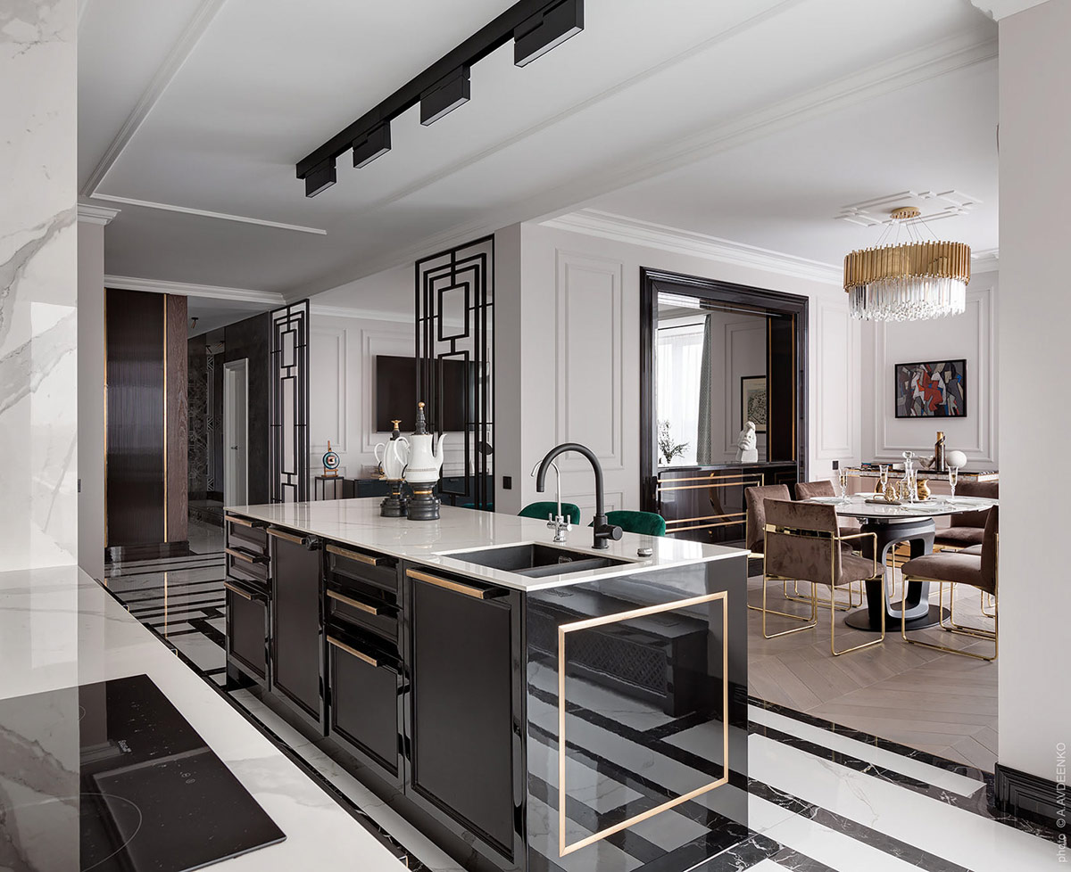 在廚房島臺(tái)后面,金色飾邊在黑色光澤壁柜上描繪出裝飾藝術(shù)圖案。
