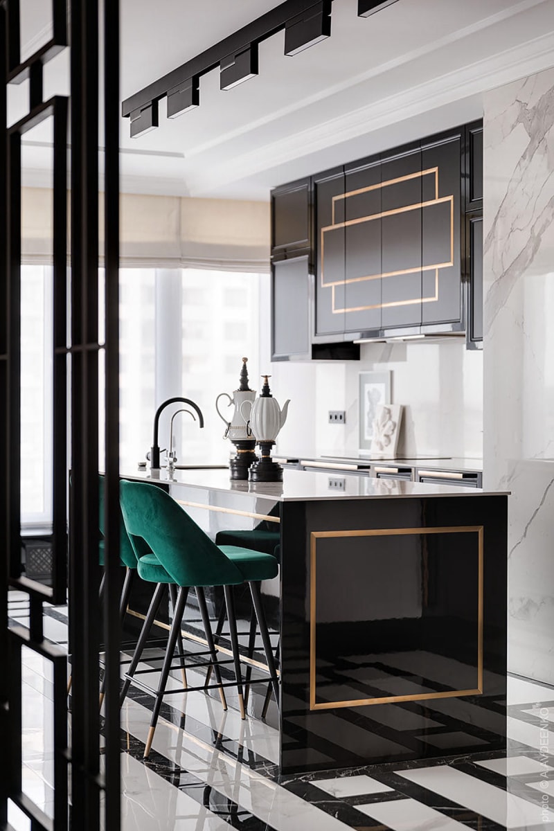 黑色光澤櫥柜、金色飾邊和祖母綠家具內(nèi)飾的組合使廚房島成為一個(gè)引人注目的展示臺(tái)。